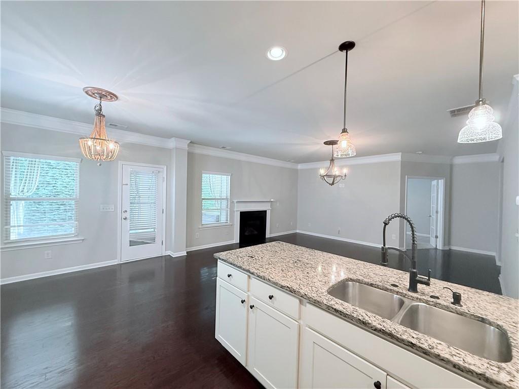 - KitchenBreakfast Bar, Cabinets White, Country Kitchen, Kitchen Island, Pantry Walk-In, Stone Counters, View to Family Room