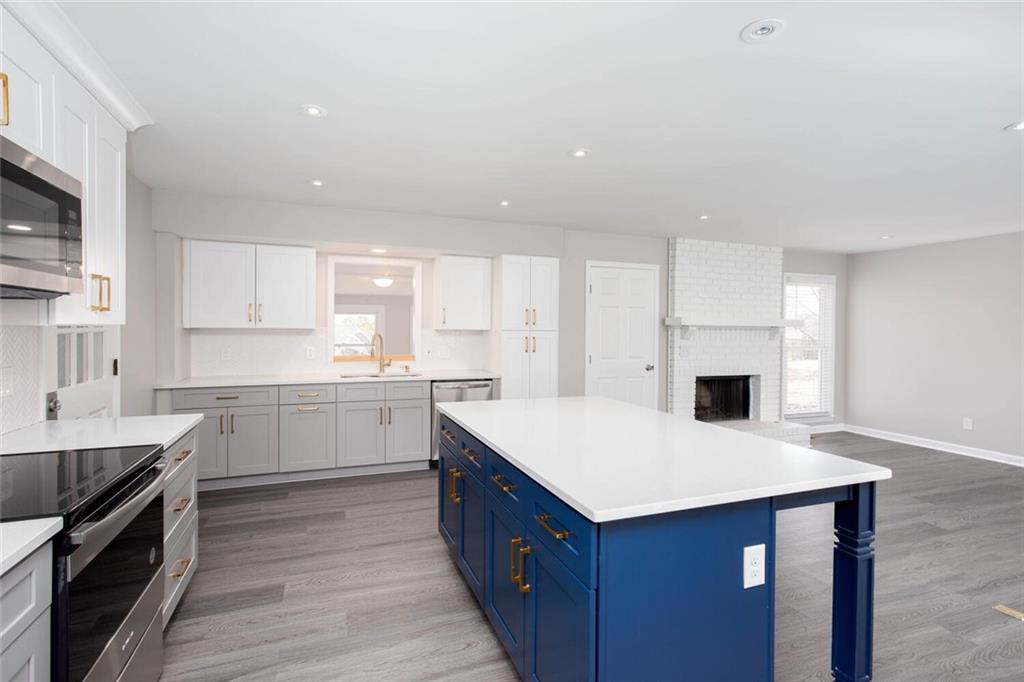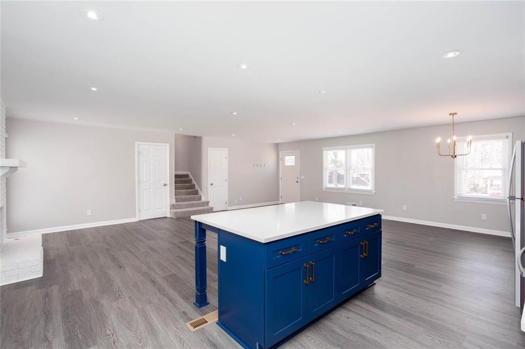 - KitchenBreakfast Bar, Breakfast Room, Cabinets White, Kitchen Island, Pantry, Stone Counters, View to Family Room