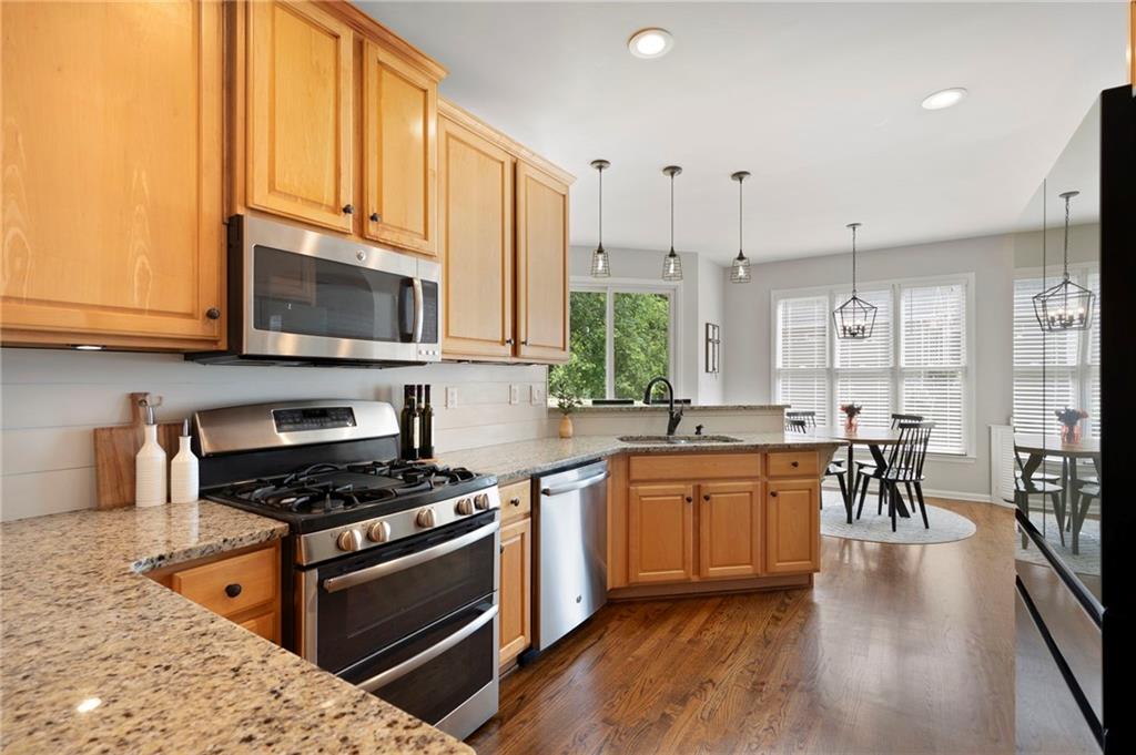 - KitchenBreakfast Bar, Breakfast Room, Cabinets Stain, Eat-in Kitchen, Pantry, Stone Counters, View to Family Room