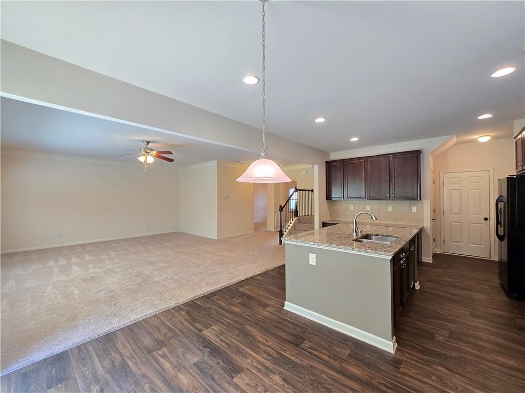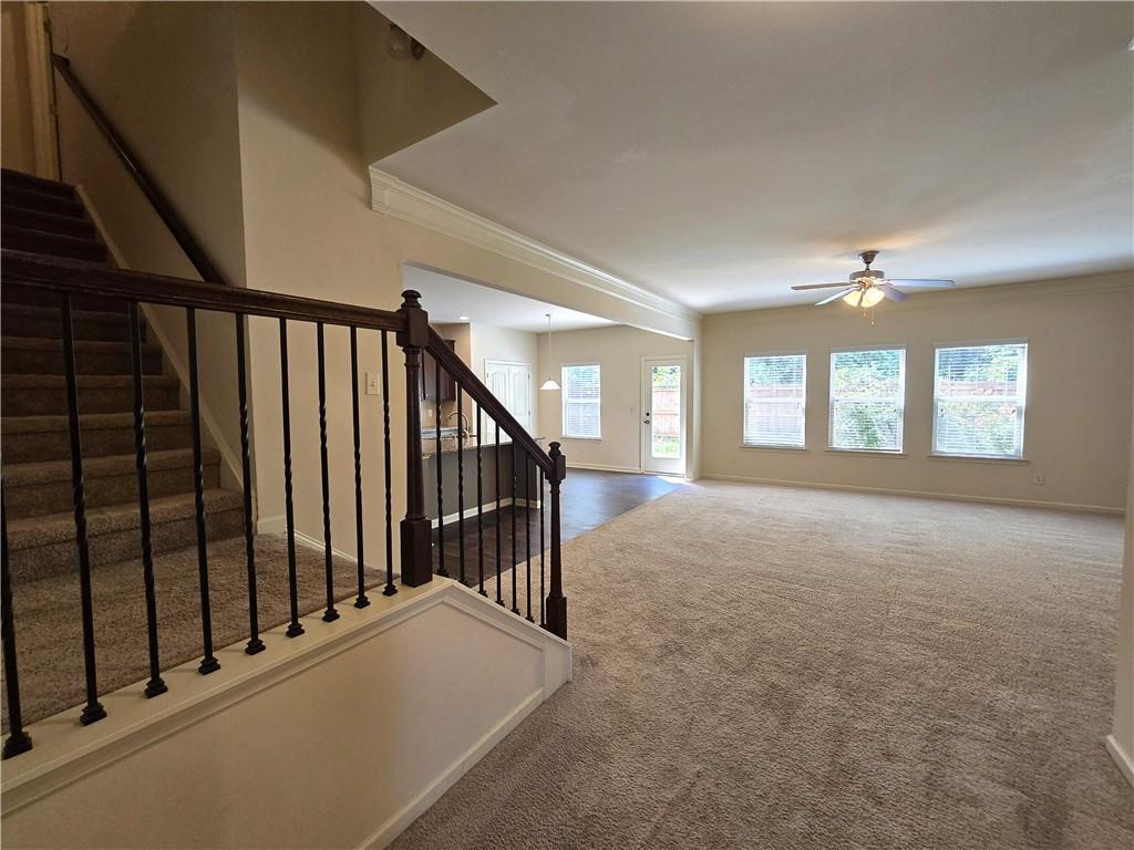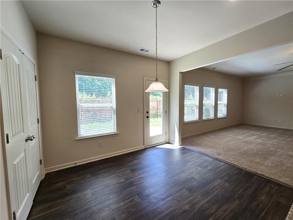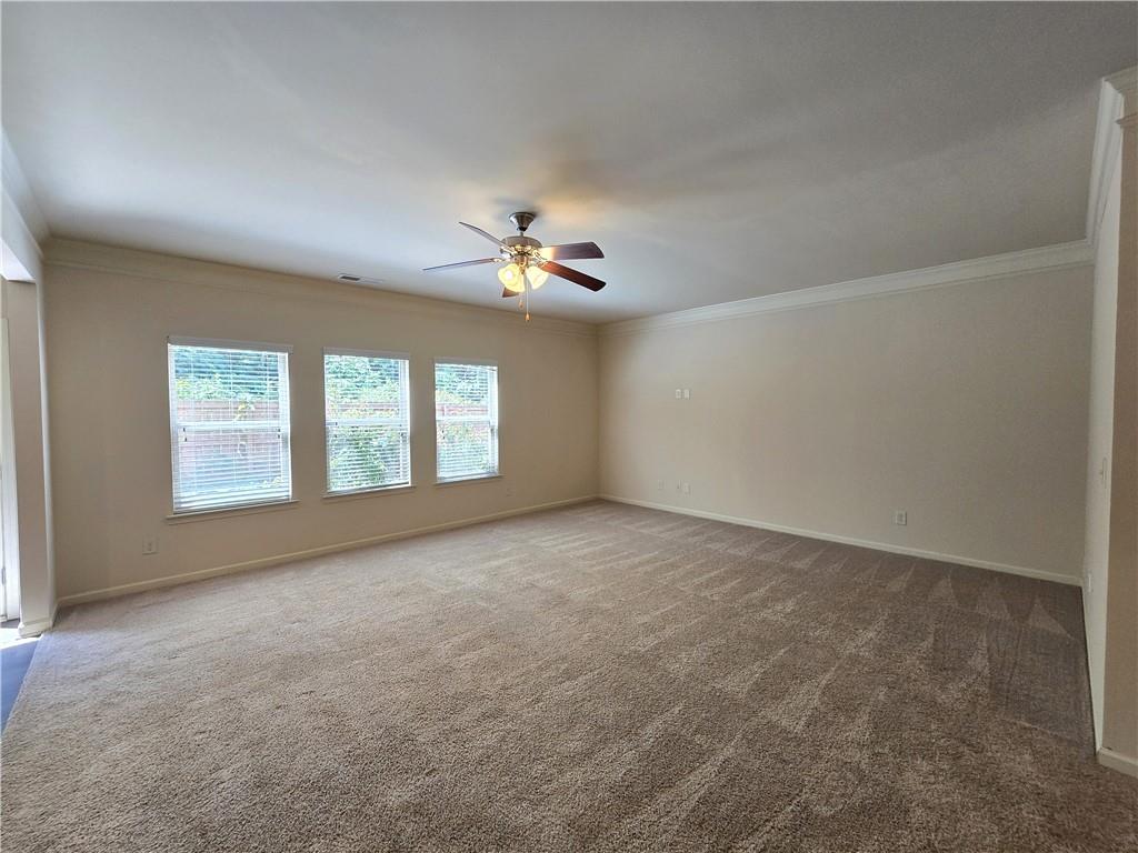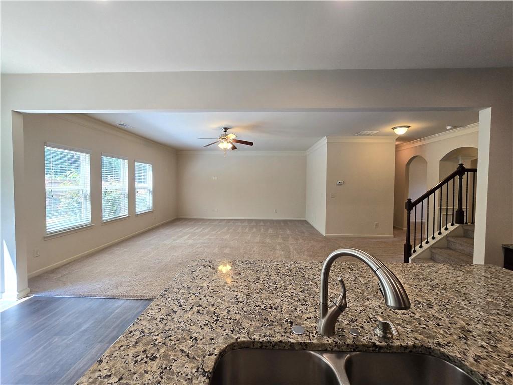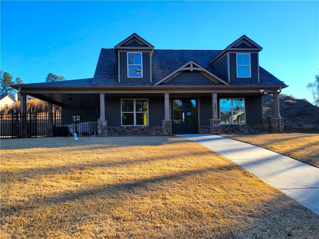 Beautiful move-in ready home conveniently located near schools, shops, parks, I-85, and Hwy 53. Two-story home features an open concept floor plan on the main level and all bedrooms located on the upper level. From the welcoming foyer, the dining room is on the right and just adjacent to it is a full bathroom and coat closet. Gorgeous Kitchen with large island, stone counters, and pantry closets opens up to the Family Room and Breakfast Nook/Dining Area. Upper level features a large Master Suite with an ensuite bathroom with a separate tub and shower, walk-in closet, and double vanities. Three secondary bedrooms, a shared bathroom, and Laundry Room are also located on the upper level. Privately fenced and leveled backyard and enjoy community amenities at Creekside Village including a clubhouse and pool! Minimum credit score of 650.