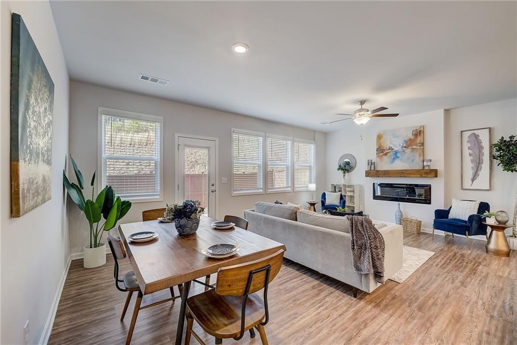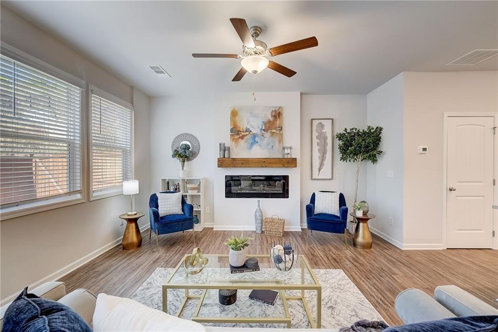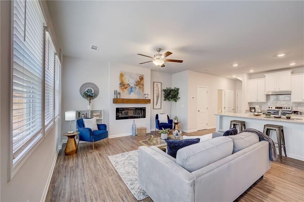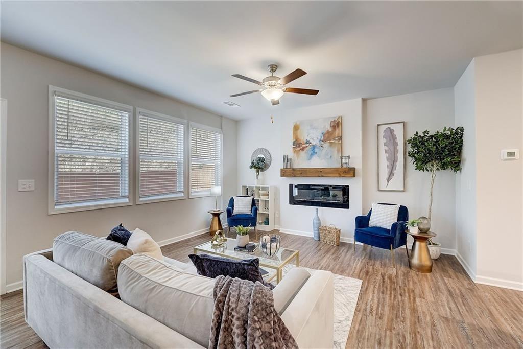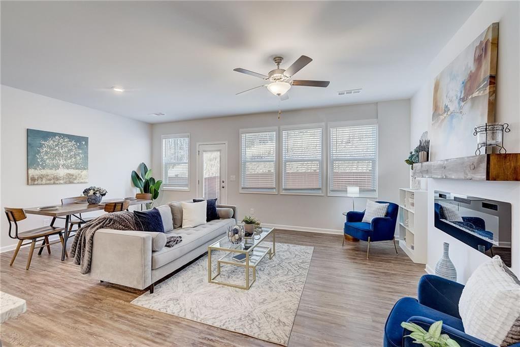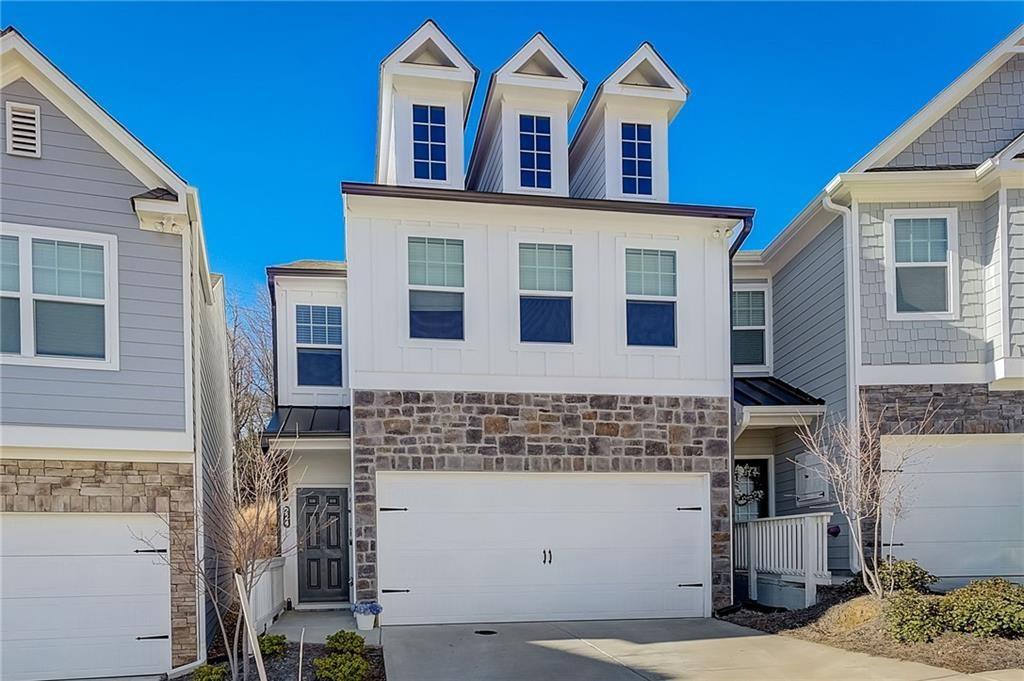 Welcome to a charming 3-bedroom, 2.5-bathroom home nestled in a serene neighborhood, where modern elegance meets cozy comfort. As you approach, you're greeted by a manicured lawn that is HOA maintained and a quaint front porch all just minutes from downtown Woodstock, shopping, I-575, restaurants, Costco, outlet shops and more. The open-concept layout seamlessly connects the living room, dining area, and kitchen, creating an inviting space for gatherings and relaxation complete with a sleek fireplace, perfect for cozy evenings spent unwinding with loved ones. Large windows allow natural light to flood the room, accentuating the tasteful decor and creating an airy ambiance. Upstairs, the owner's suite is a tranquil retreat, featuring a spacious bedroom with a soaring ceiling, a walk-in closet, and a luxurious en-suite bathroom complete with a soaking tub, a glass-enclosed shower, and dual vanities. Two additional bedrooms offer comfort and privacy for family members or guests, each thoughtfully designed with ample closet space and large windows overlooking the lush surroundings. Outside, a private backyard oasis awaits, offering a serene escape from the hustle and bustle of everyday life. With its blend of modern amenities and timeless charm, this 3-bedroom, 2.5-bathroom home is a true sanctuary where every detail has been carefully curated to ensure a life of comfort and elegance.