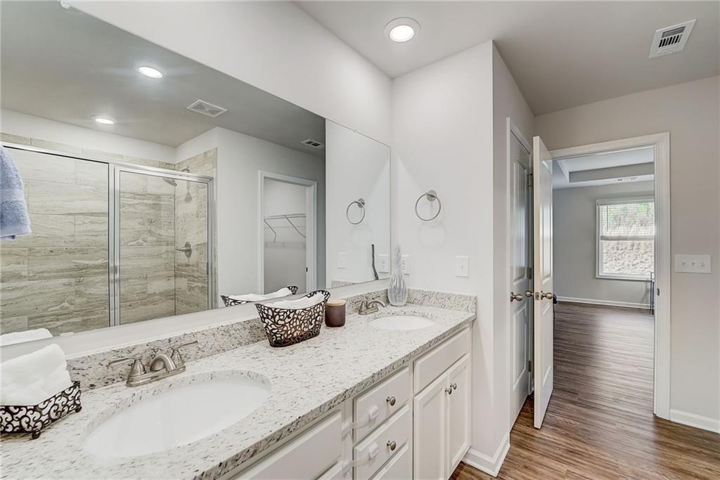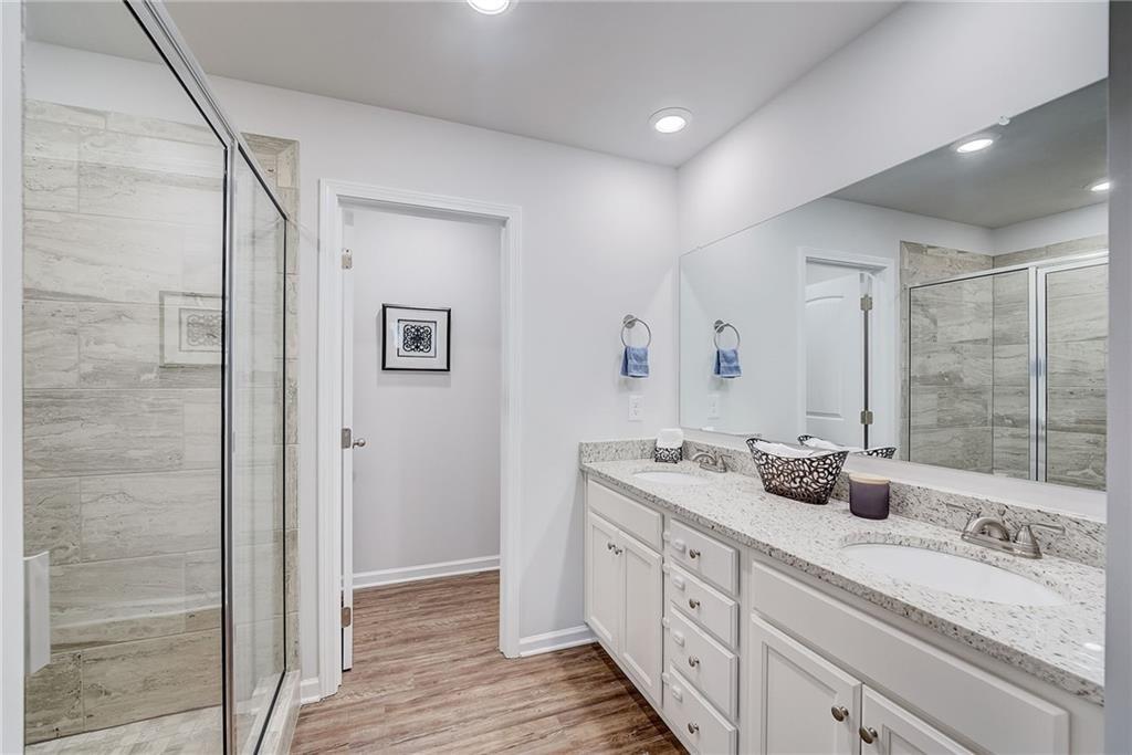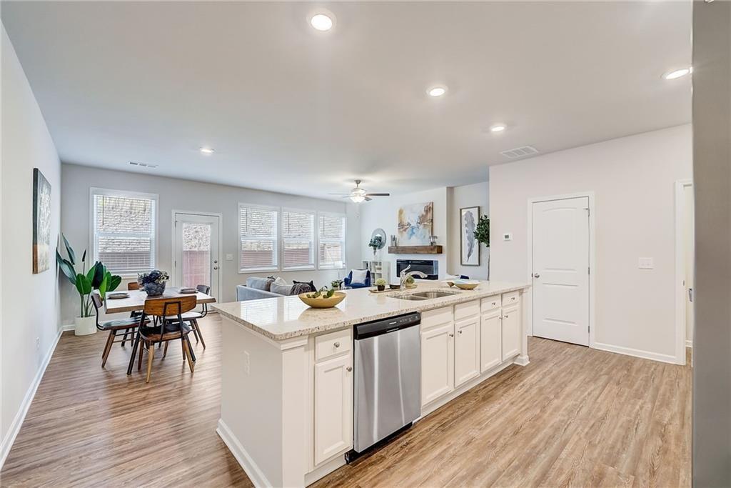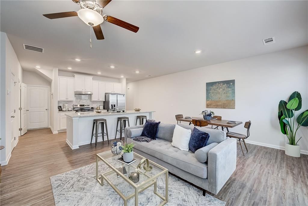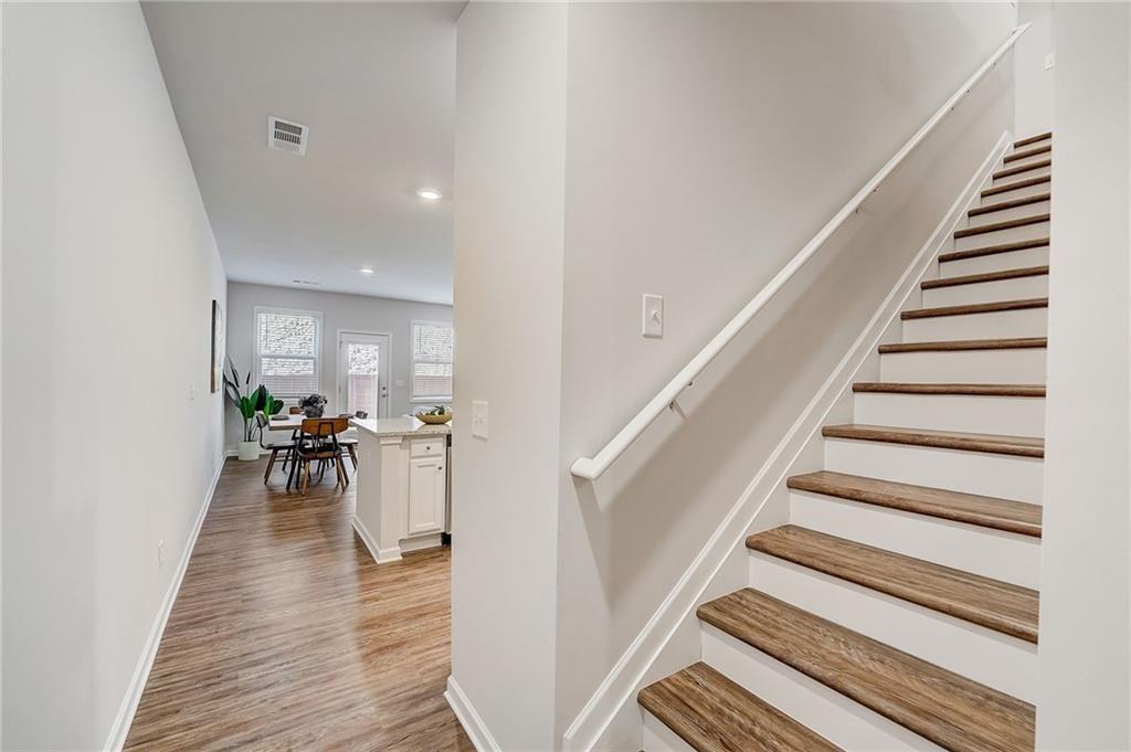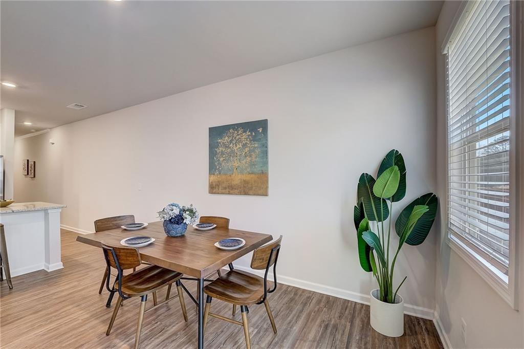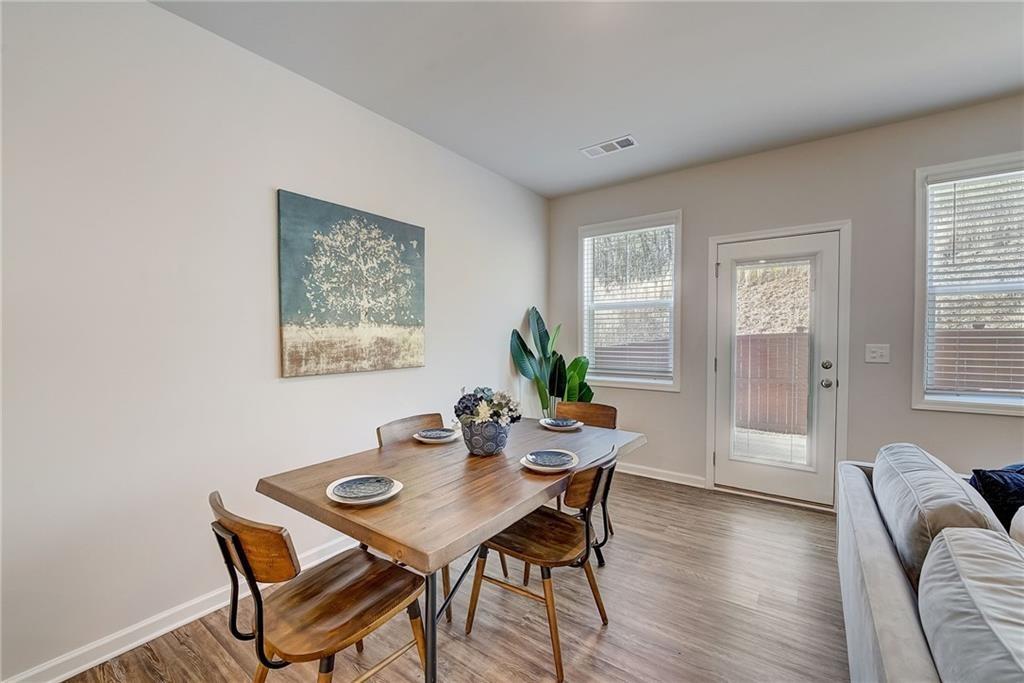 Welcome to a charming 3-bedroom, 2.5-bathroom home nestled in a serene neighborhood, where modern elegance meets cozy comfort. As you approach, you're greeted by a manicured lawn that is HOA maintained and a quaint front porch all just minutes from downtown Woodstock, shopping, I-575, restaurants, Costco, outlet shops and more. The open-concept layout seamlessly connects the living room, dining area, and kitchen, creating an inviting space for gatherings and relaxation complete with a sleek fireplace, perfect for cozy evenings spent unwinding with loved ones. Large windows allow natural light to flood the room, accentuating the tasteful decor and creating an airy ambiance. Upstairs, the owner's suite is a tranquil retreat, featuring a spacious bedroom with a soaring ceiling, a walk-in closet, and a luxurious en-suite bathroom complete with a soaking tub, a glass-enclosed shower, and dual vanities. Two additional bedrooms offer comfort and privacy for family members or guests, each thoughtfully designed with ample closet space and large windows overlooking the lush surroundings. Outside, a private backyard oasis awaits, offering a serene escape from the hustle and bustle of everyday life. With its blend of modern amenities and timeless charm, this 3-bedroom, 2.5-bathroom home is a true sanctuary where every detail has been carefully curated to ensure a life of comfort and elegance.
