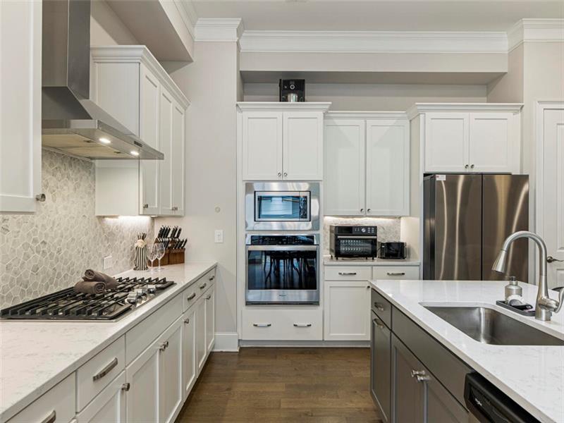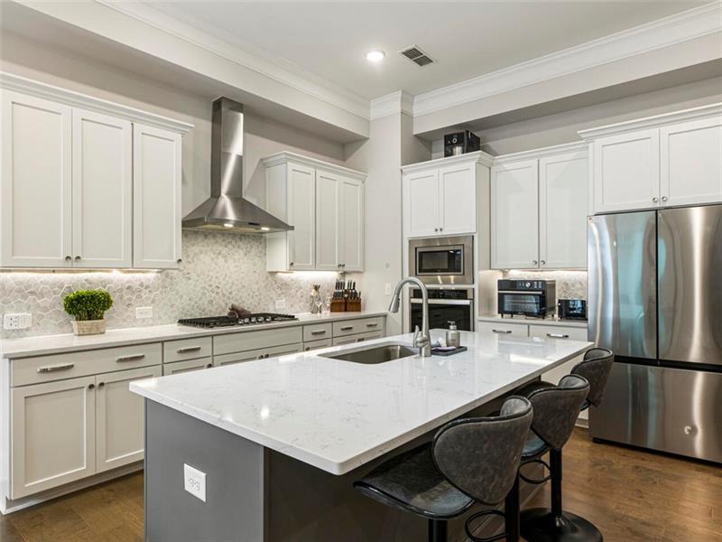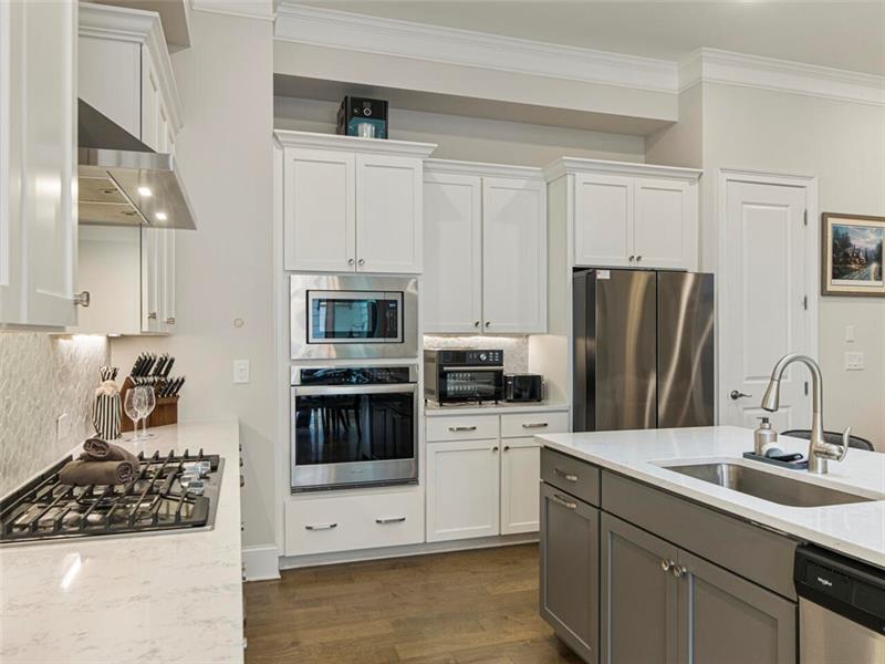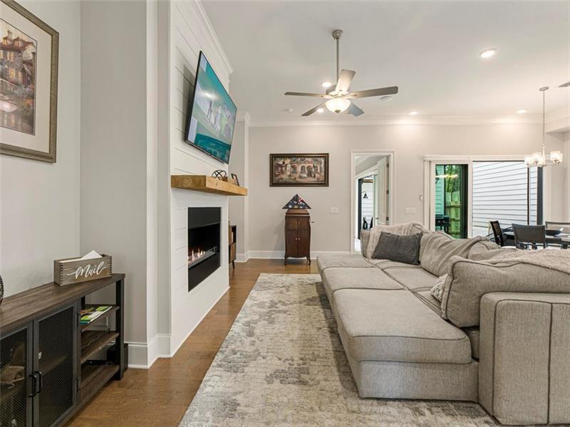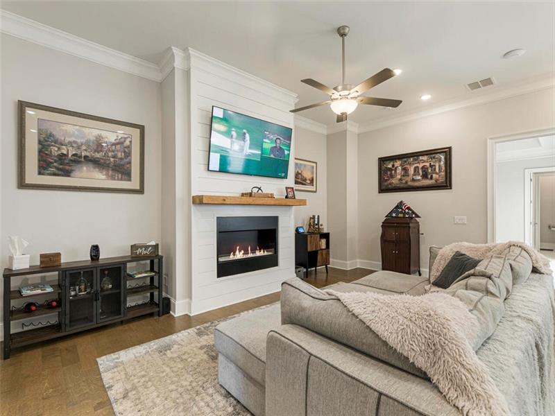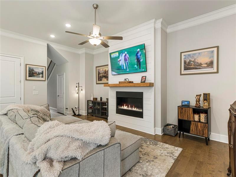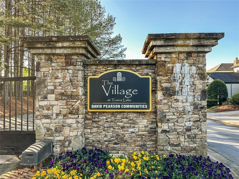Situated in The Village at Towne Lake, this Seagrove-plan home is only .5+/- miles from Downtown Woodstock and the Woofstock dog park. 4.25% assumable VA loan available. The home includes an abundance of designer upgrades and features throughout. Enter into the two-story foyer, which leads to the incredible living area, which boasts 11-foot ceilings and Shaw weathered engineered hardwood floors. The fireside family room offers built-ins flanking the fireplace and a beamed ceiling with recessed lighting. The open floor plan allows the living room to flow seamlessly into the kitchen and sunlit dining area. The gourmet kitchen impresses with an island with seating, quartz countertops, double-stacked white upper cabinetry contrasted with warm wooden cabinets below, a 48-inch vent hood, a marble tile backsplash and stainless-steel appliances. Two telescoping sliding doors open fully to the courtyard, seamlessly uniting the interior and exterior living spaces. The same style doors open the main-level primary suite, which also connects to the courtyard. The primary suite also includes a luxurious en suite bathroom with dual vanities, an oversized, step-less entry, spa-like shower and a walk-in closet with built-ins and one of two washer and dryer sets. A half bathroom and access to the two-car garage complete the main level. The upstairs commences with a large landing lined with an office or study area and TV-watching area. This level also includes two en suite bedrooms, an oversized bonus room with lots of natural light and a second laundry room with a utility sink and storage options. The gated community of The Village at Towne Lake offers fantastic amenities, including a clubhouse, a fitness center, a large pool, outdoor firepits and an outdoor fireplace, a bocce ball court, two pickleball courts and two dog parks. Take your golf cart to Downtown Woodstock and enjoy the award-winning restaurants, shops and events, all just moments from your front door. Welcome home!