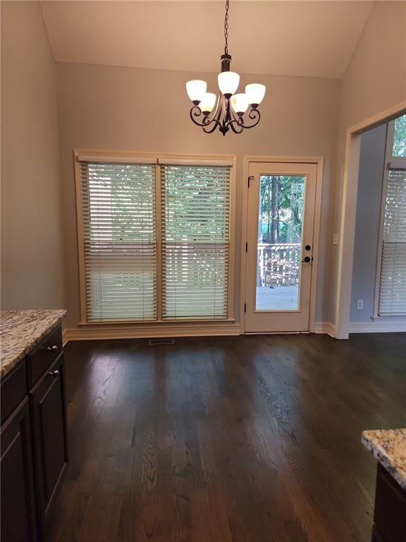 - KitchenBreakfast Bar, Cabinets Stain, Eat-in Kitchen, Pantry, Stone Counters, View to Family Room