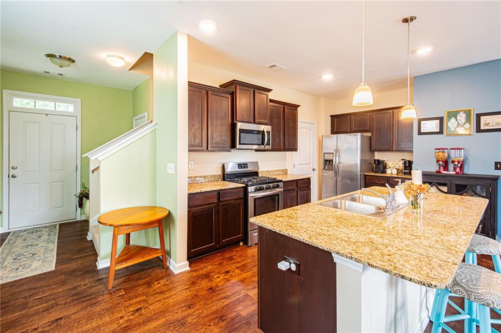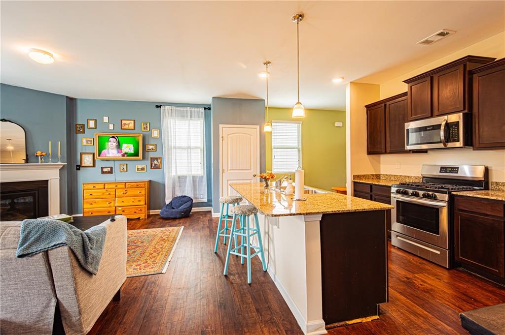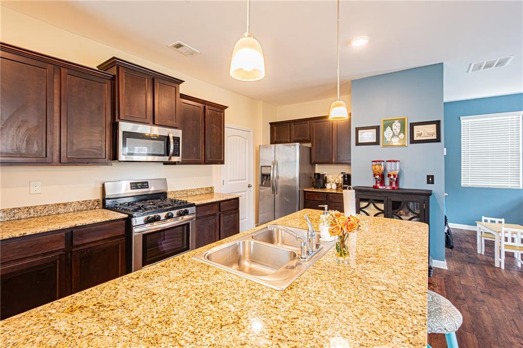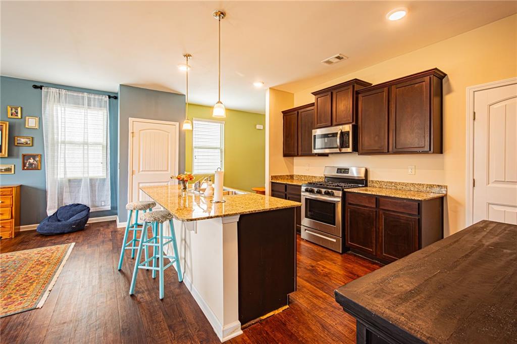 - KitchenBreakfast Bar, Cabinets Stain, Kitchen Island, Pantry Walk-In, Stone Counters, View to Family Room