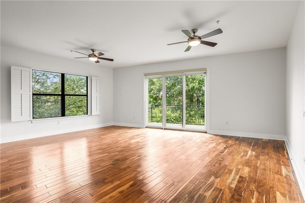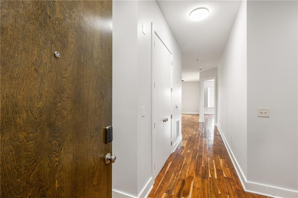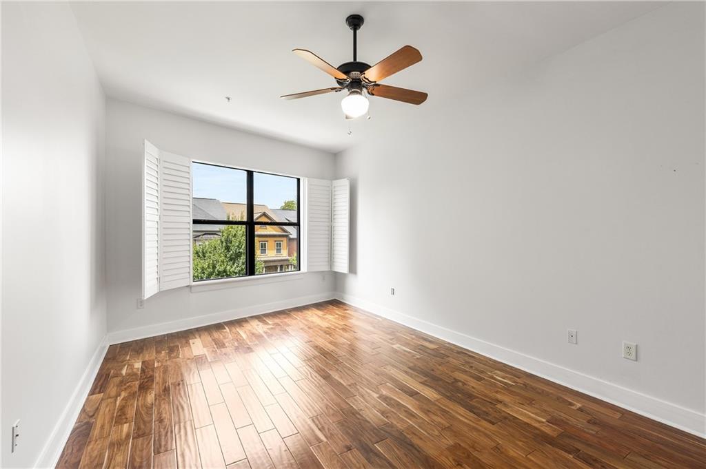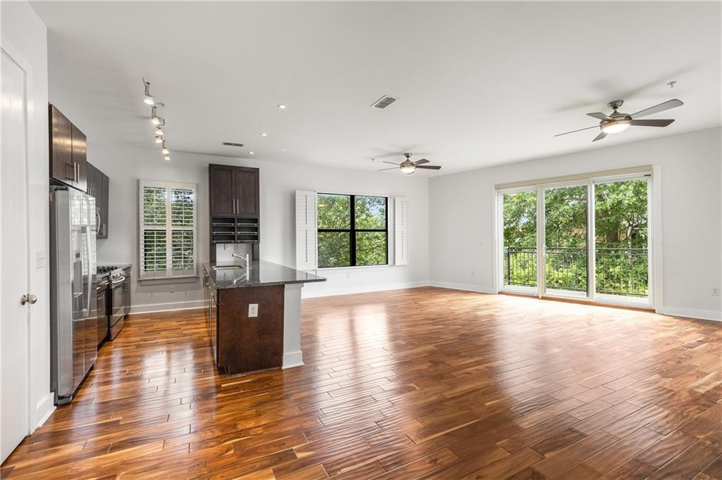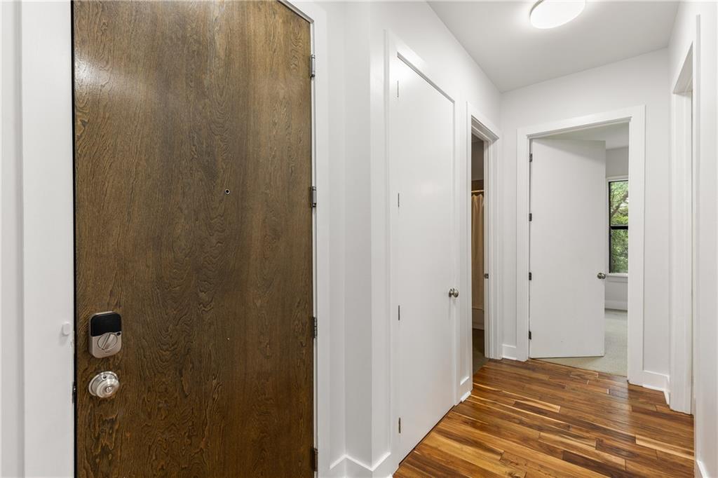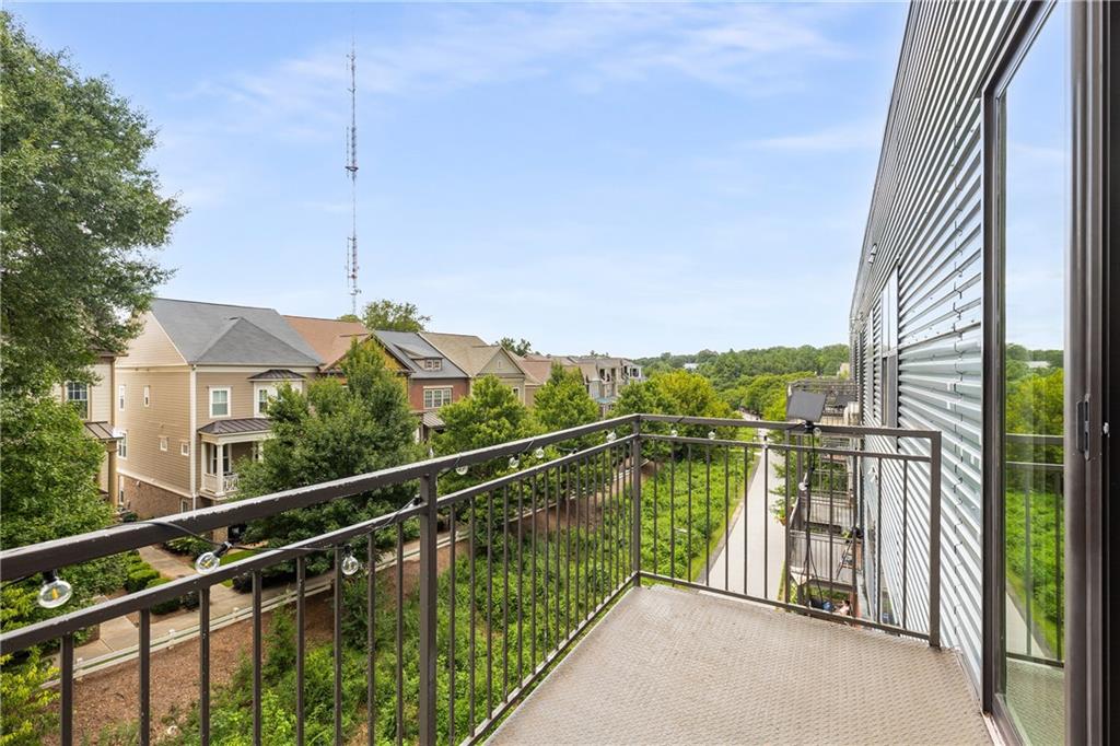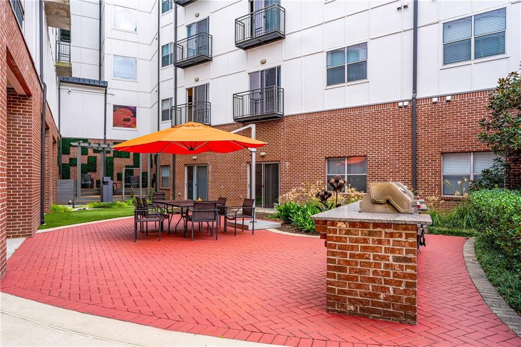 Welcome to Grinnell Lofts, a boutique residential building situated directly on the BeltLine with unmatched access to dining, retail, and green space. This rare top-floor corner residence offers elevated finishes, a spacious layout, and a prime location in one of Atlanta's most connected neighborhoods. The home features ample interior space with 10-foot ceilings, hardwood floors throughout, and large windows with custom plantation shutters that fill the space with natural light. The open floor plan includes a generous living and dining area that opens to a private balcony overlooking the BeltLine. A built-in office nook offers flexible space for work, reading, or creative use. The kitchen is equipped with stainless steel appliances, a gas range, and clean, modern design that integrates seamlessly into the main living area. The two-bedroom layout places each bedroom on opposite sides of the home, allowing for comfort and privacy. Ample storage, including two hallway closets and vertical built-ins, supports a clutter-free lifestyle. Community features include two deeded, covered parking spaces, secure keypad entry, and access to a rooftop lounge with sweeping views. Residents also enjoy a private pool and a fitness facility through X3 Sports, offering modern equipment and a full schedule of group classes. Grinnell Lofts is conveniently located near restaurants, markets, shops, and parks with direct BeltLine access, making it easy to explore nearby destinations including Krog Street Market, Ponce City Market, and Piedmont Park. This home offers a refined blend of comfort, convenience, and location with direct access to one of Atlanta's most active corridors.