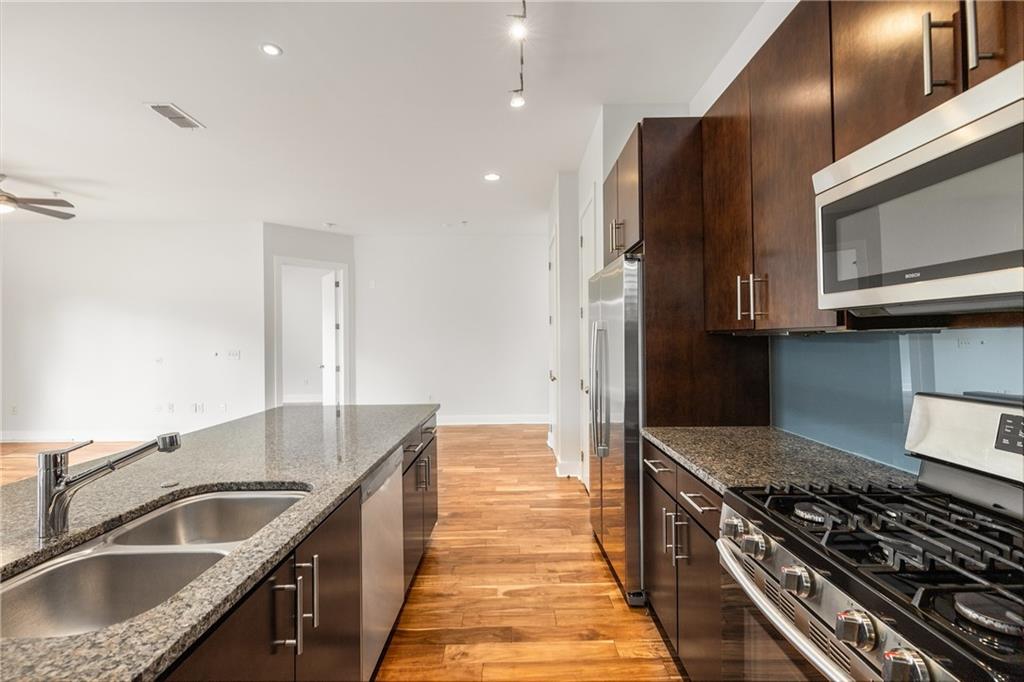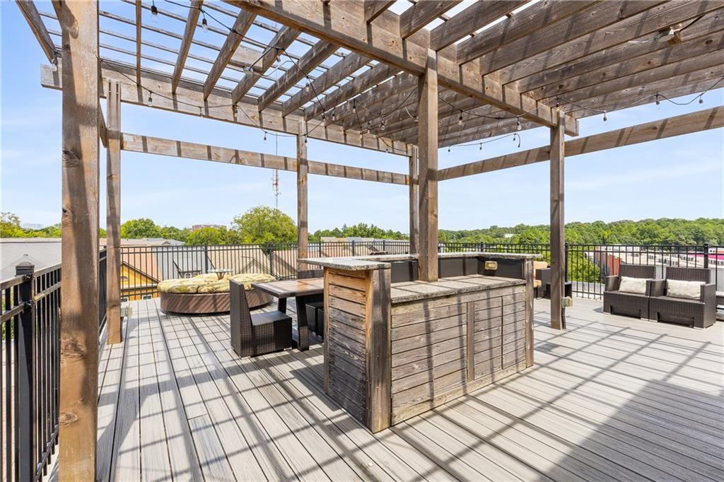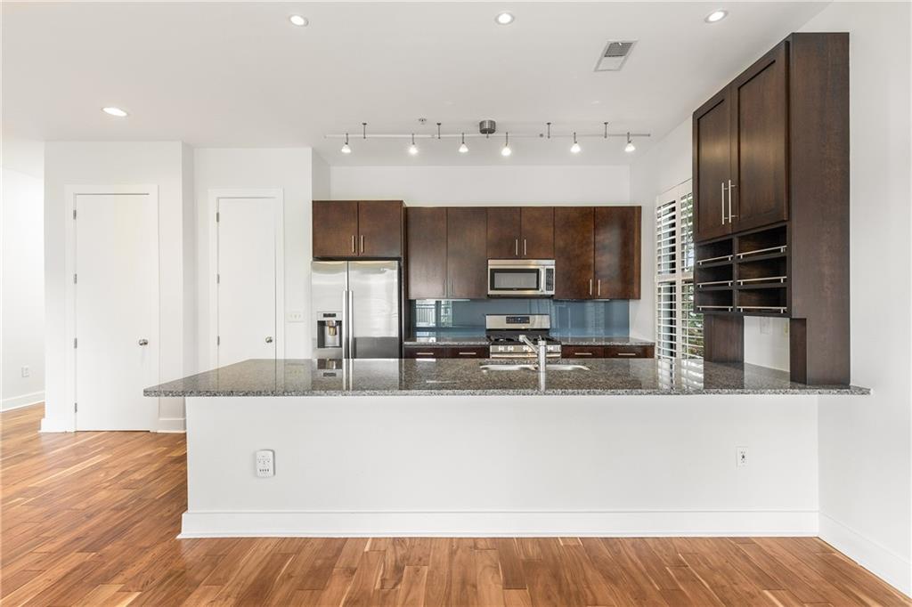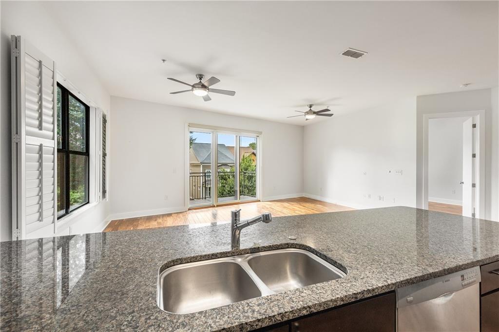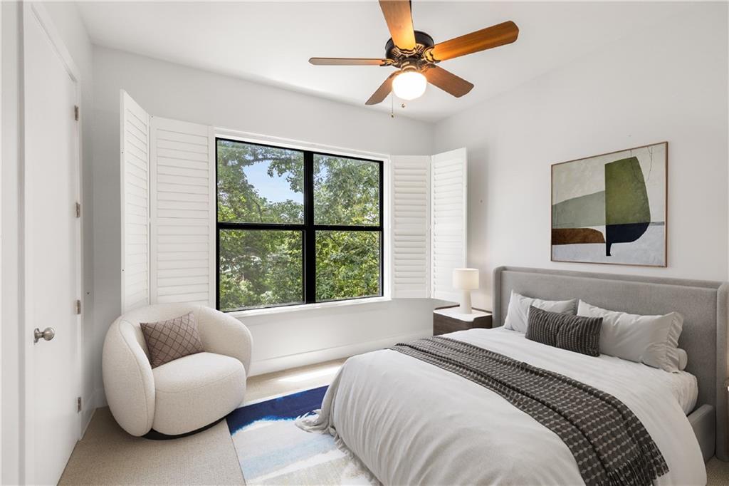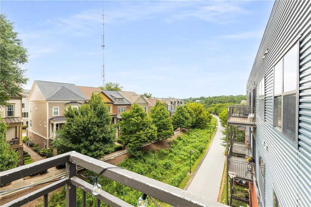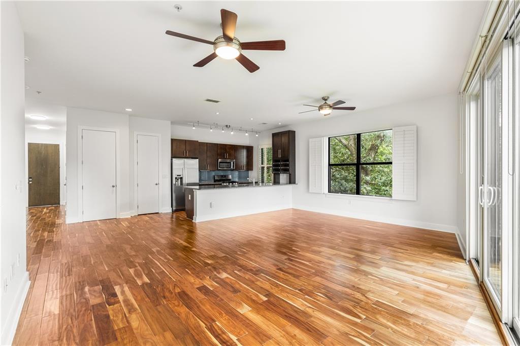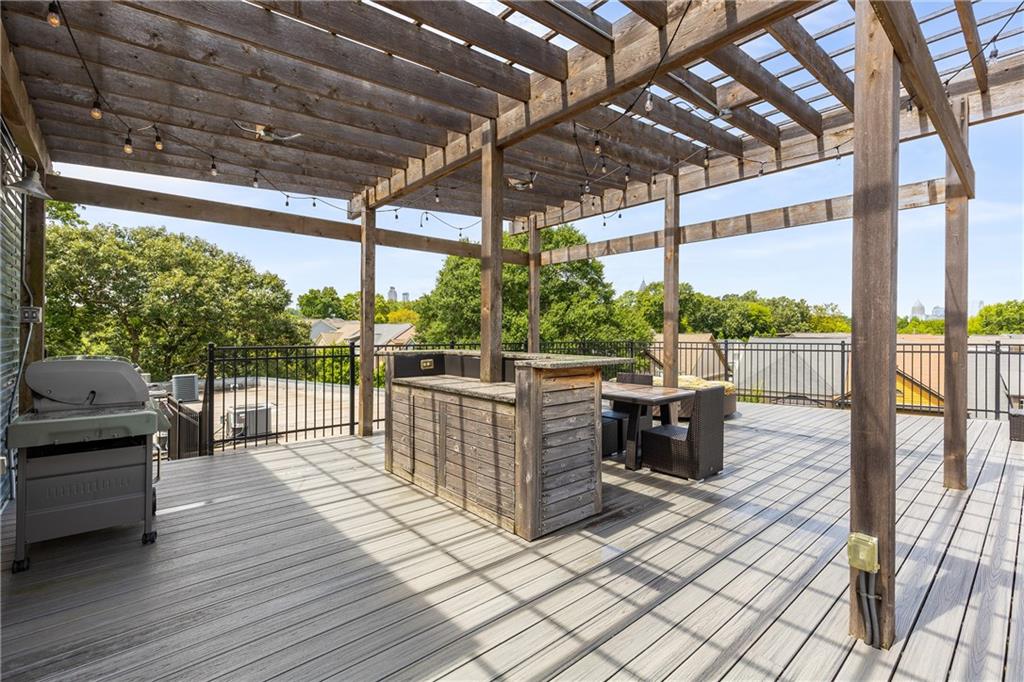 Welcome to Grinnell Lofts, a boutique residential building situated directly on the BeltLine with unmatched access to dining, retail, and green space. This rare top-floor corner residence offers elevated finishes, a spacious layout, and a prime location in one of Atlanta's most connected neighborhoods. The home features ample interior space with 10-foot ceilings, hardwood floors throughout, and large windows with custom plantation shutters that fill the space with natural light. The open floor plan includes a generous living and dining area that opens to a private balcony overlooking the BeltLine. A built-in office nook offers flexible space for work, reading, or creative use. The kitchen is equipped with stainless steel appliances, a gas range, and clean, modern design that integrates seamlessly into the main living area. The two-bedroom layout places each bedroom on opposite sides of the home, allowing for comfort and privacy. Ample storage, including two hallway closets and vertical built-ins, supports a clutter-free lifestyle. Community features include two deeded, covered parking spaces, secure keypad entry, and access to a rooftop lounge with sweeping views. Residents also enjoy a private pool and a fitness facility through X3 Sports, offering modern equipment and a full schedule of group classes. Grinnell Lofts is conveniently located near restaurants, markets, shops, and parks with direct BeltLine access, making it easy to explore nearby destinations including Krog Street Market, Ponce City Market, and Piedmont Park. This home offers a refined blend of comfort, convenience, and location with direct access to one of Atlanta's most active corridors.