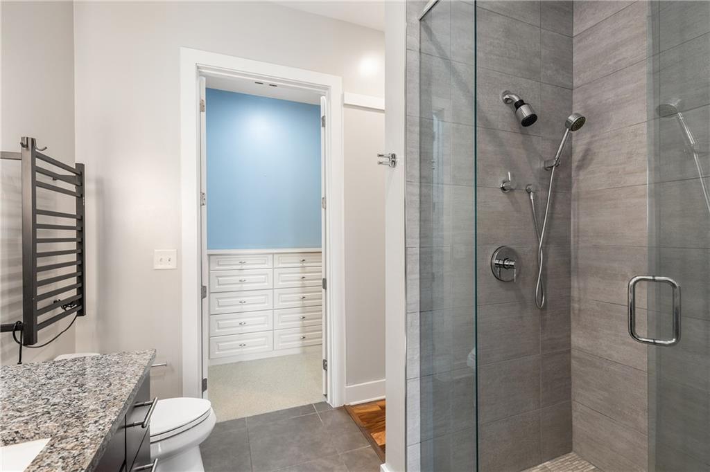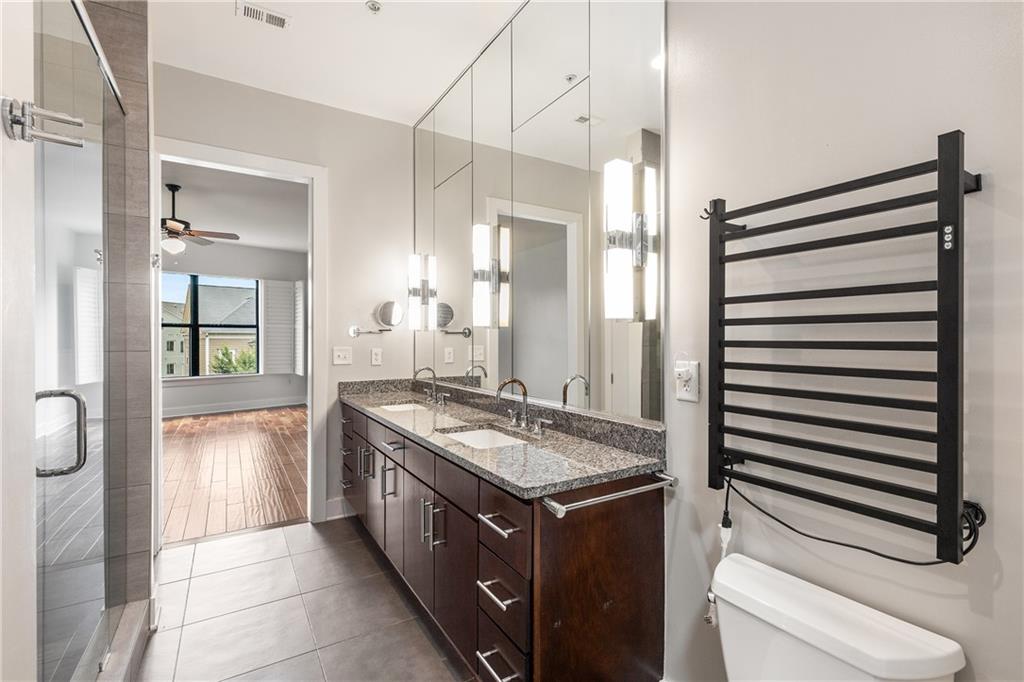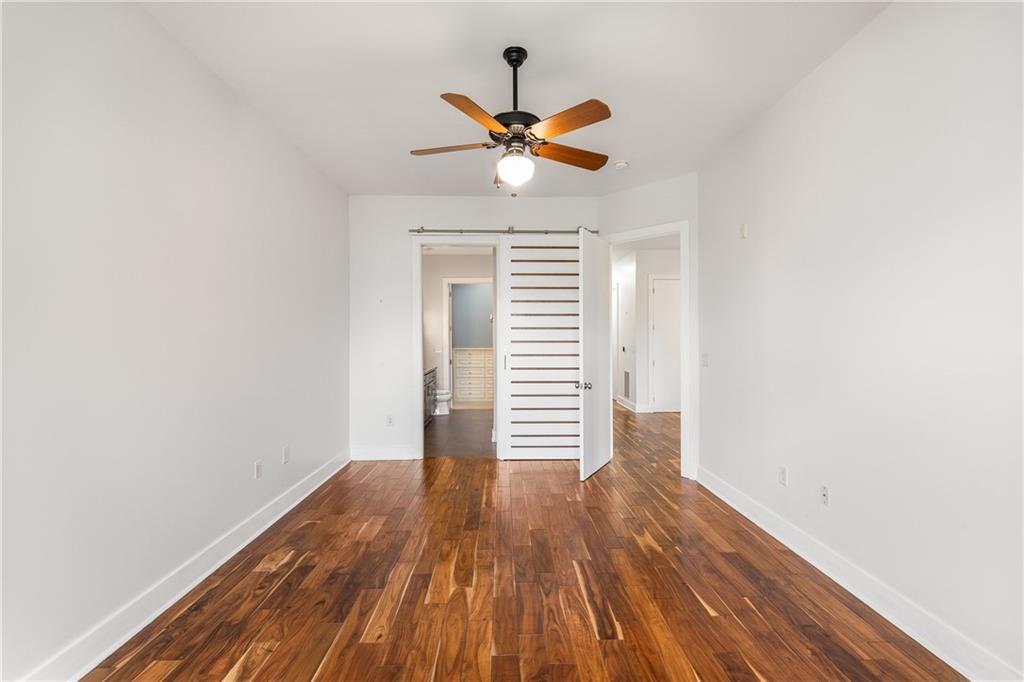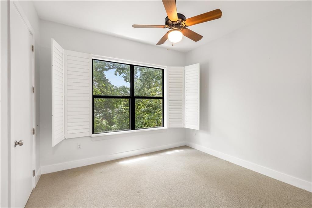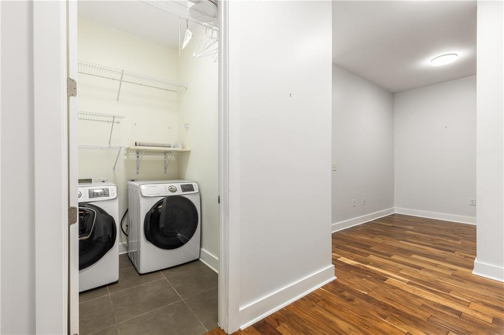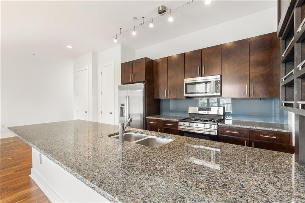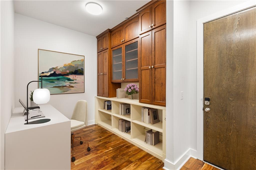 Welcome to Grinnell Lofts, a boutique residential building situated directly on the BeltLine with unmatched access to dining, retail, and green space. This rare top-floor corner residence offers elevated finishes, a spacious layout, and a prime location in one of Atlanta's most connected neighborhoods. The home features ample interior space with 10-foot ceilings, hardwood floors throughout, and large windows with custom plantation shutters that fill the space with natural light. The open floor plan includes a generous living and dining area that opens to a private balcony overlooking the BeltLine. A built-in office nook offers flexible space for work, reading, or creative use. The kitchen is equipped with stainless steel appliances, a gas range, and clean, modern design that integrates seamlessly into the main living area. The two-bedroom layout places each bedroom on opposite sides of the home, allowing for comfort and privacy. Ample storage, including two hallway closets and vertical built-ins, supports a clutter-free lifestyle. Community features include two deeded, covered parking spaces, secure keypad entry, and access to a rooftop lounge with sweeping views. Residents also enjoy a private pool and a fitness facility through X3 Sports, offering modern equipment and a full schedule of group classes. Grinnell Lofts is conveniently located near restaurants, markets, shops, and parks with direct BeltLine access, making it easy to explore nearby destinations including Krog Street Market, Ponce City Market, and Piedmont Park. This home offers a refined blend of comfort, convenience, and location with direct access to one of Atlanta's most active corridors.