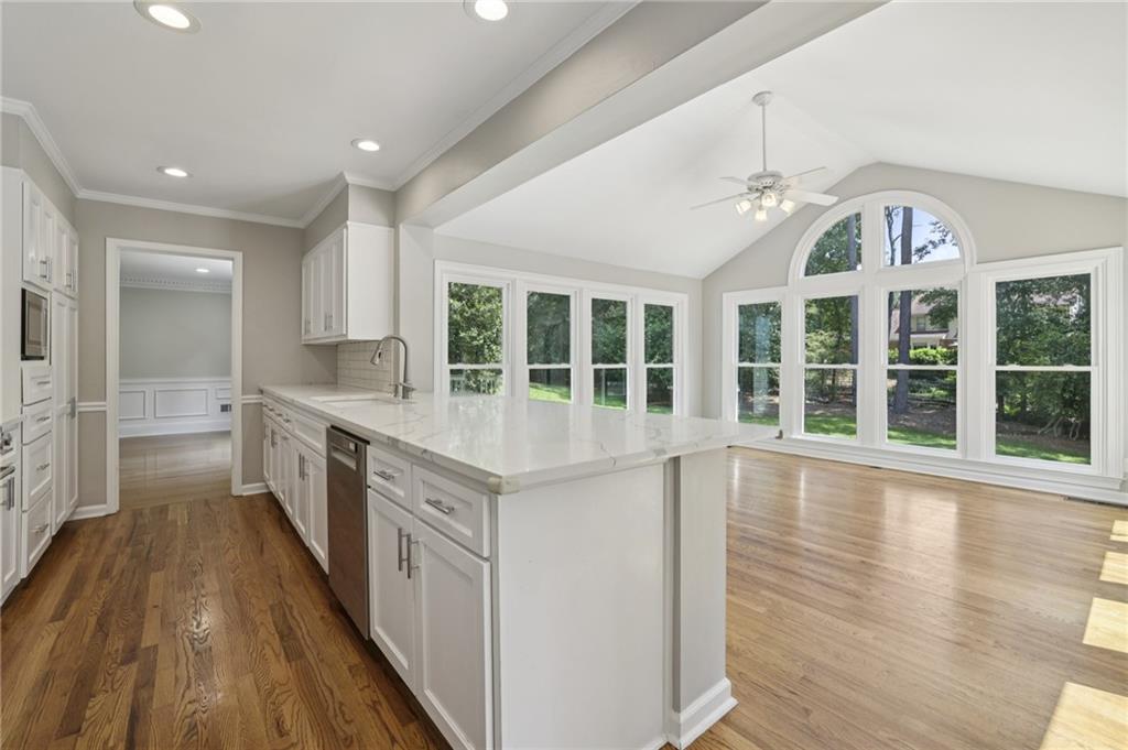 - KitchenBreakfast Room, Cabinets White, Stone Counters, View to Family Room