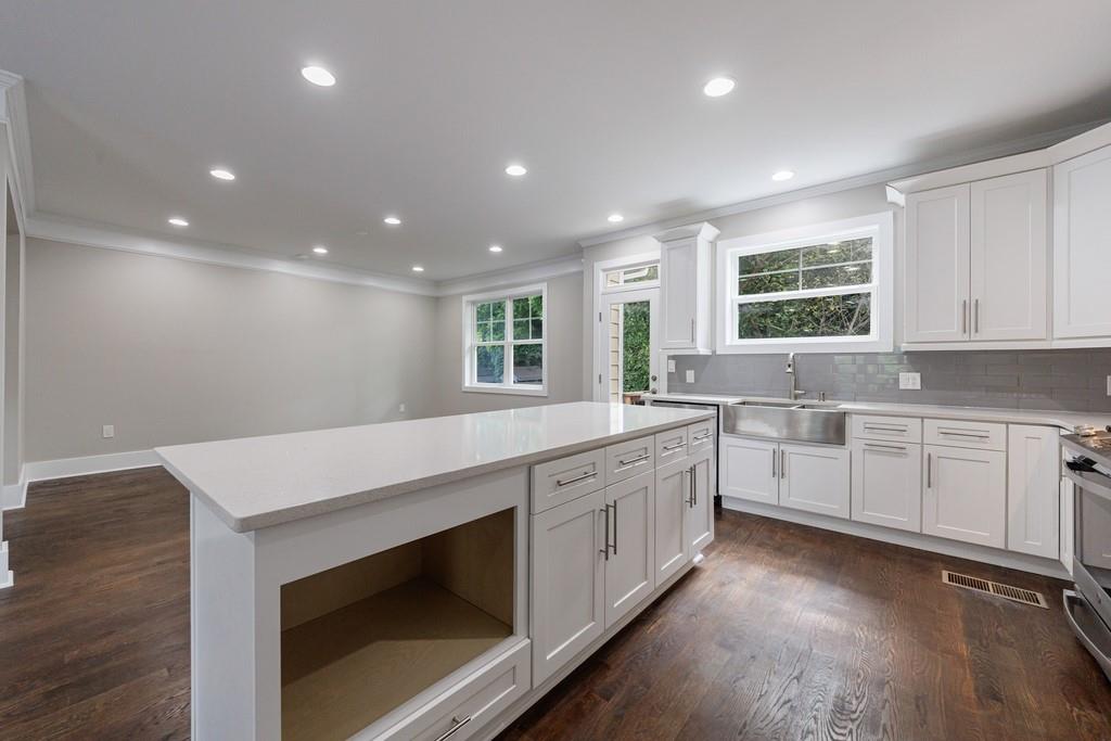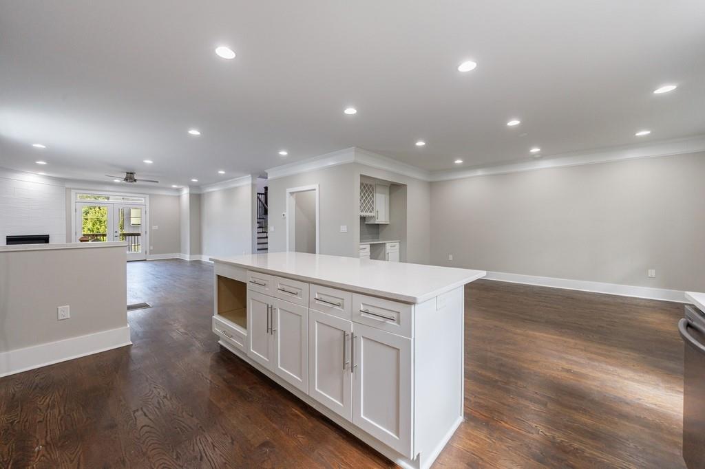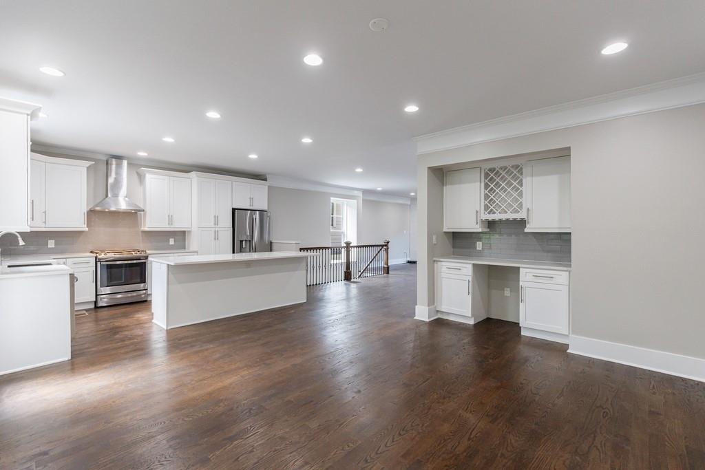 - KitchenBreakfast Bar, Cabinets White, Kitchen Island, Stone Counters, View to Family Room