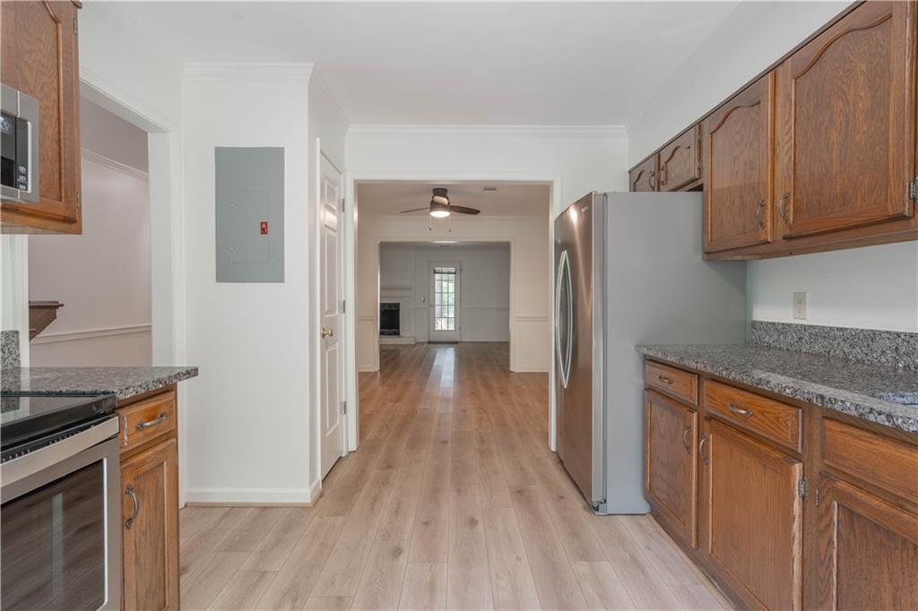 - KitchenCabinets White, Pantry, Stone Counters, View to Family Room