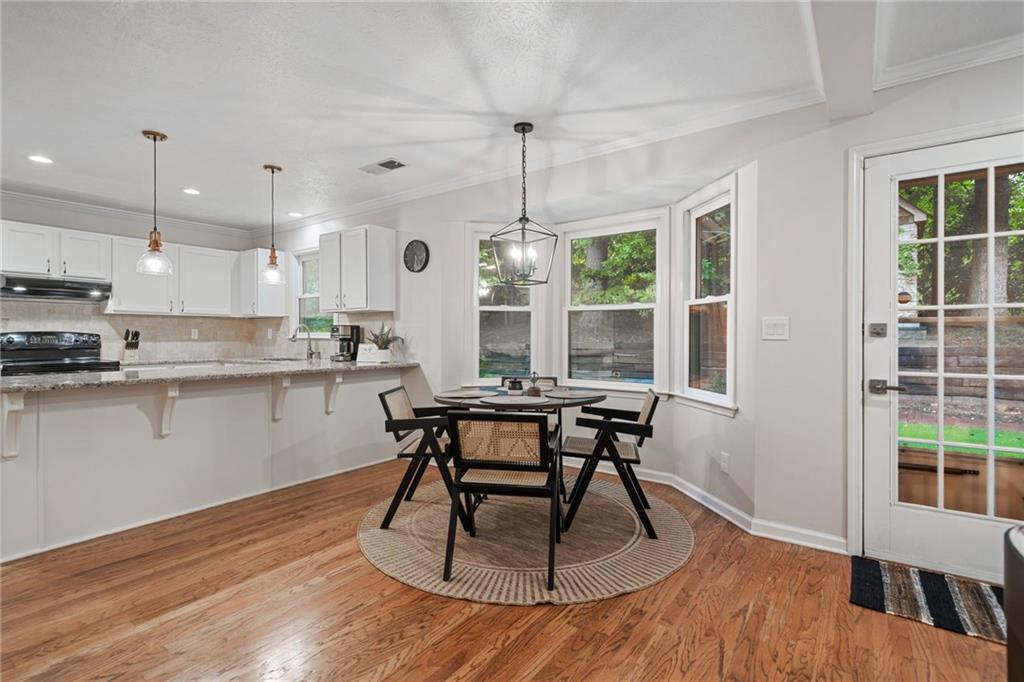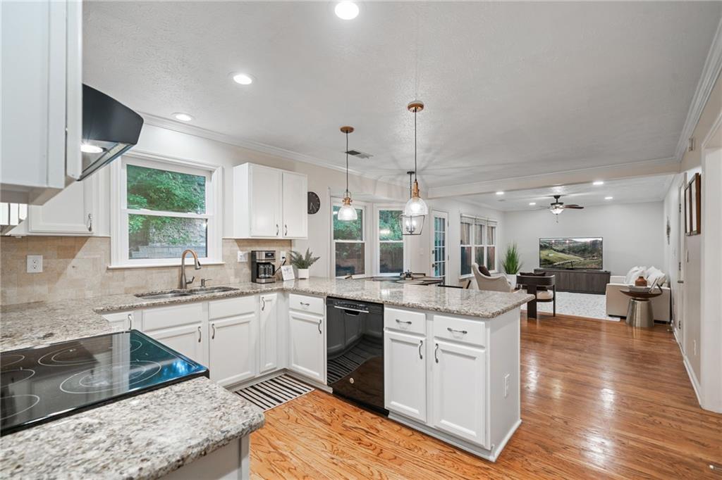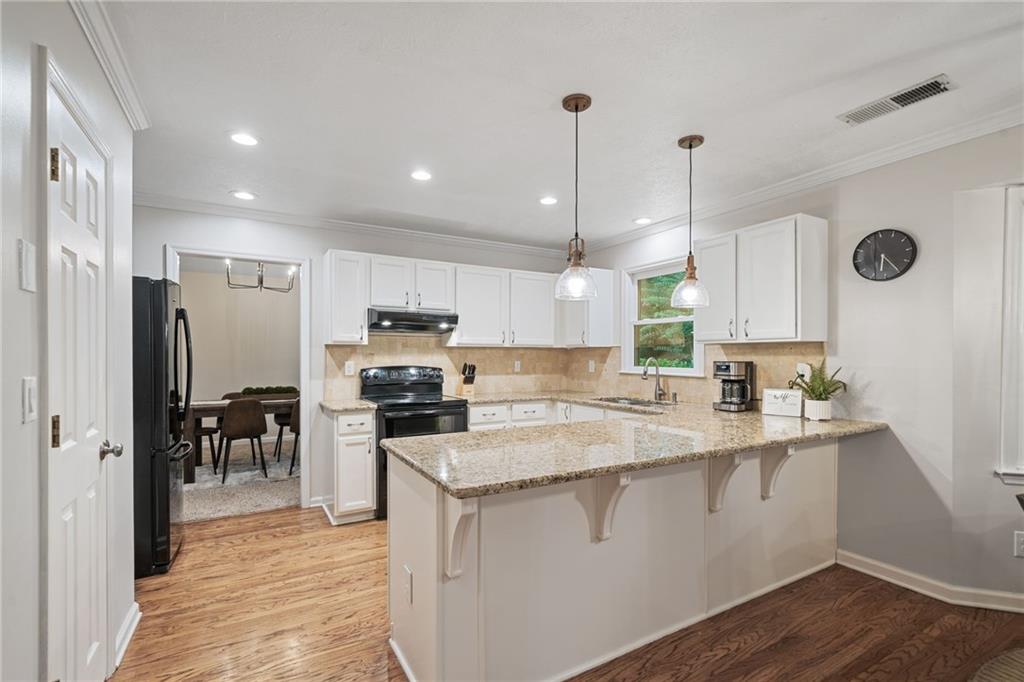 - KitchenBreakfast Bar, Breakfast Room, Eat-in Kitchen, Pantry, Stone Counters, View to Family Room