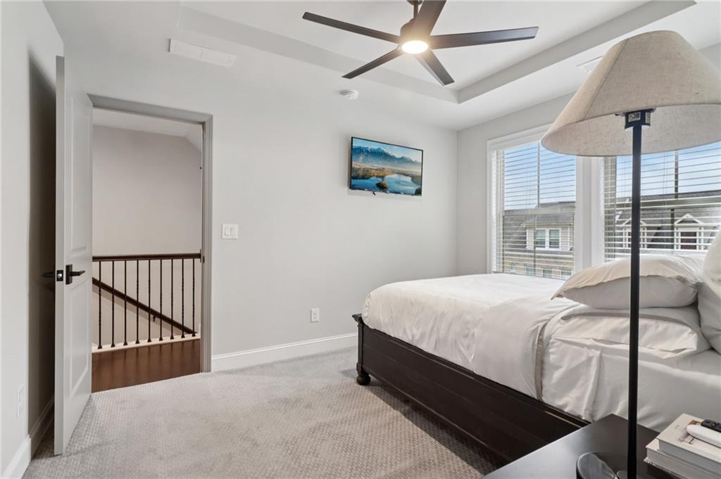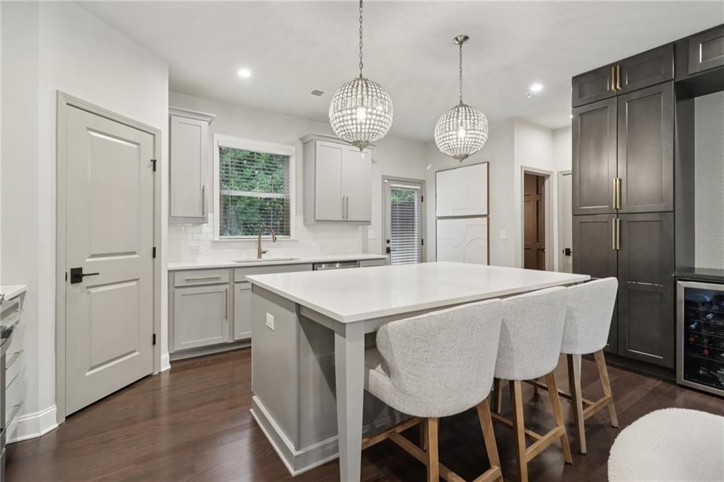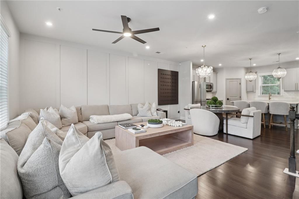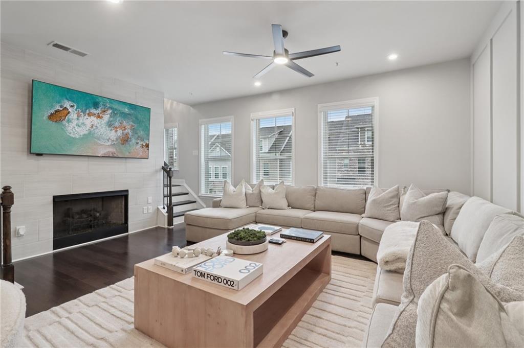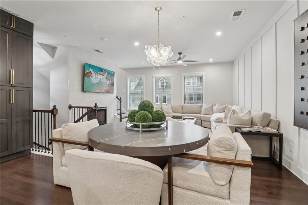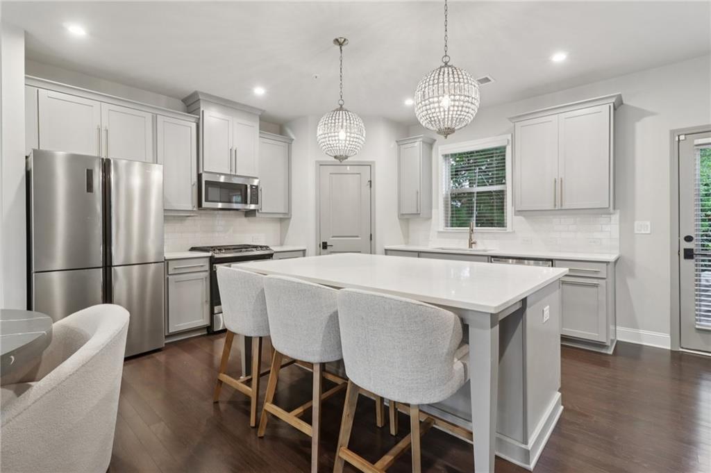 Step into this designer-finished end-unit townhome tucked away on serene Brooklyn Ct—where luxury, comfort, and everyday functionality come together seamlessly. From the moment you walk in, soaring ceilings and natural light create a bright, airy ambiance, while the fresh, neutral palette and dark wood-style flooring set the tone for sophisticated living. The open-concept main level offers a warm, inviting fireside living room that flows effortlessly into the dining space—ideal for hosting gatherings or cozy evenings at home. The beautifully designed kitchen is a true focal point, boasting quartz countertops, a custom tile backsplash, sleek stainless steel appliances, and a stylish breakfast bar with significant storage—perfect for morning coffee or casual bites. Upstairs, retreat to the expansive primary suite with vaulted ceilings, a walk-in closet with built-in storage, and bathroom featuring double vanities, LED mirror and elegant designer tilework. Two additional bedrooms each have bathrooms attached or conveniently nearby, offering flexibility and comfort for guests, a home office, or a growing household. Enjoy the functionality of a thoughtfully designed laundry area with built-in storage, as well as multiple storage closets throughout the home—plus additional attic storage to keep everything organized and within reach. Step outside to a spacious, private backyard—perfect for play, pets, or al fresco entertaining under the stars. Set in a quiet, well-maintained community with convenient access to shopping, dining, and top-rated schools, this home offers a turnkey lifestyle with timeless appeal.