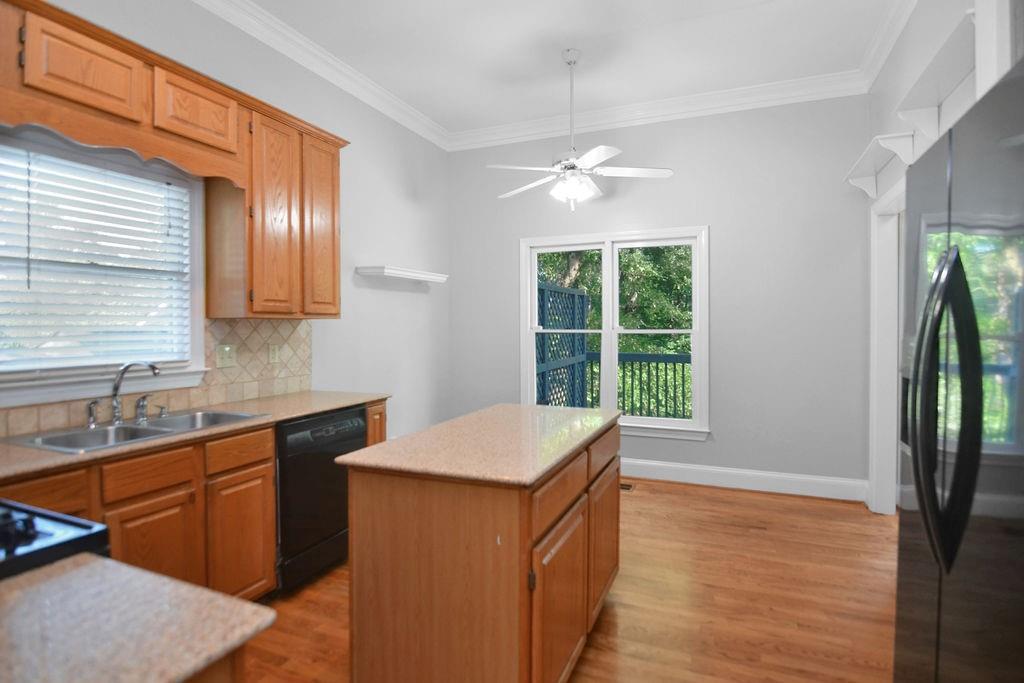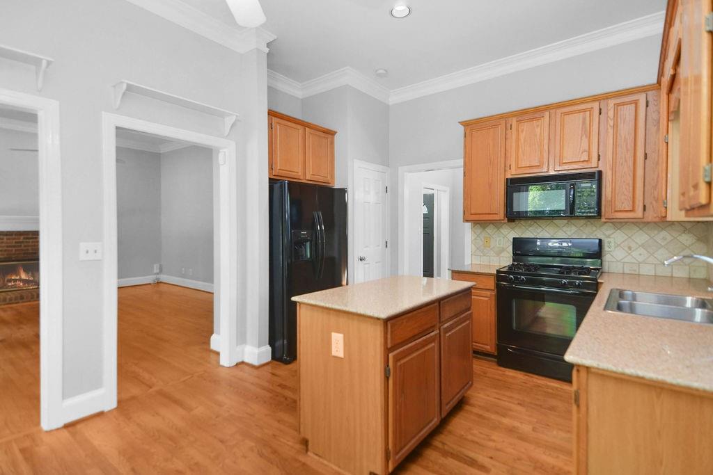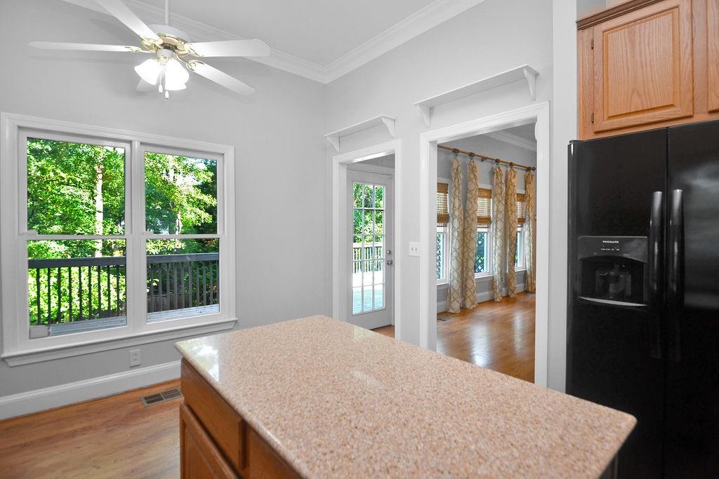 - KitchenCabinets Stain, Eat-in Kitchen, Kitchen Island, Pantry, Stone Counters, View to Family Room