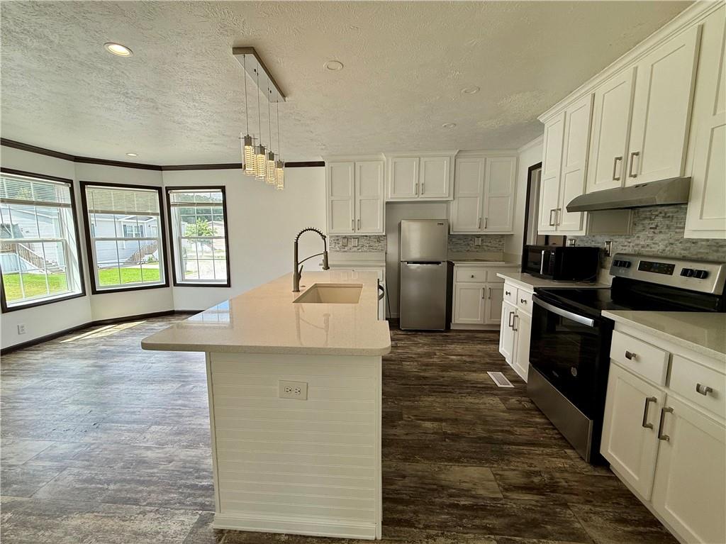 - KitchenCabinets White, Kitchen Island, Solid Surface Counters, View to Family Room