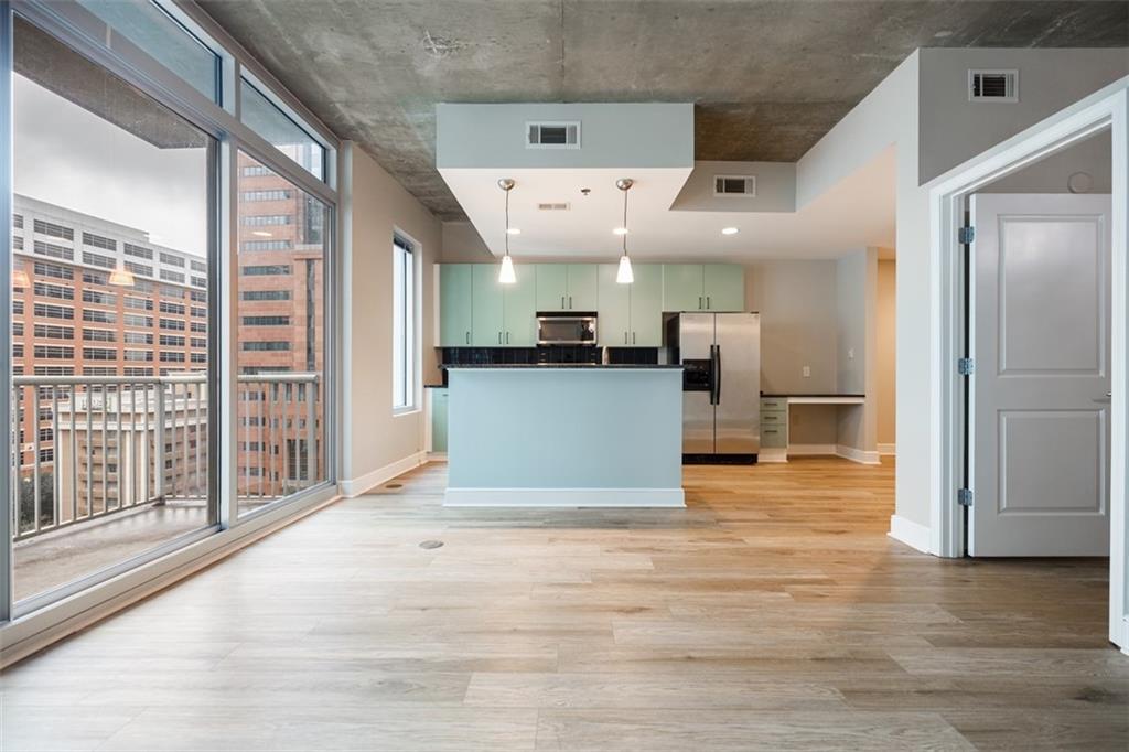 Great opportunity to live in one of Midtown’s most sought after condo communities. This updated 1 Bedroom / 1 Bathroom loft style condo offers light-filled living spaces featuring 10-ft ceilings, floor to ceiling windows, hardwood floors, granite countertops, updated stainless appliances, and a large private balcony with gorgeous city views. Thoughtful upgrades set this unit apart including the bathroom that has been updated with a tile/tub shower combo featuring a tasteful and bright modern tile. A built-in desk nook offers functionality and flexibility for working from home. Tall ceilings extend into the spacious bedroom, which includes a large walk-in closet and chandelier lighting. Additional updates include a new HVAC system, a SilencePlus Bosch stainless dishwasher, and fresh interior paint throughout the unit. Plaza Midtown offers a full suite of resort-style amenities, including 24-hour concierge, package delivery service, a fully equipped fitness center, clubroom with catering kitchen, on-site maintenance, and a beautifully landscaped plaza level featuring a saltwater pool, lush lounging areas, a fire pit, and gas grills. There’s even an elevator button that takes you straight down to Publix right in the building for convenient grocery shopping! Centrally located, you're just minutes away from Piedmont Park, Atlanta Botanical Gardens, the Atlanta BeltLine, Georgia Tech, Midtown MARTA station, and a wide selection of top-tier dining, shopping, nightlife and cultural attractions. Don't miss this gem in one of Atlanta's hottest neighborhoods!