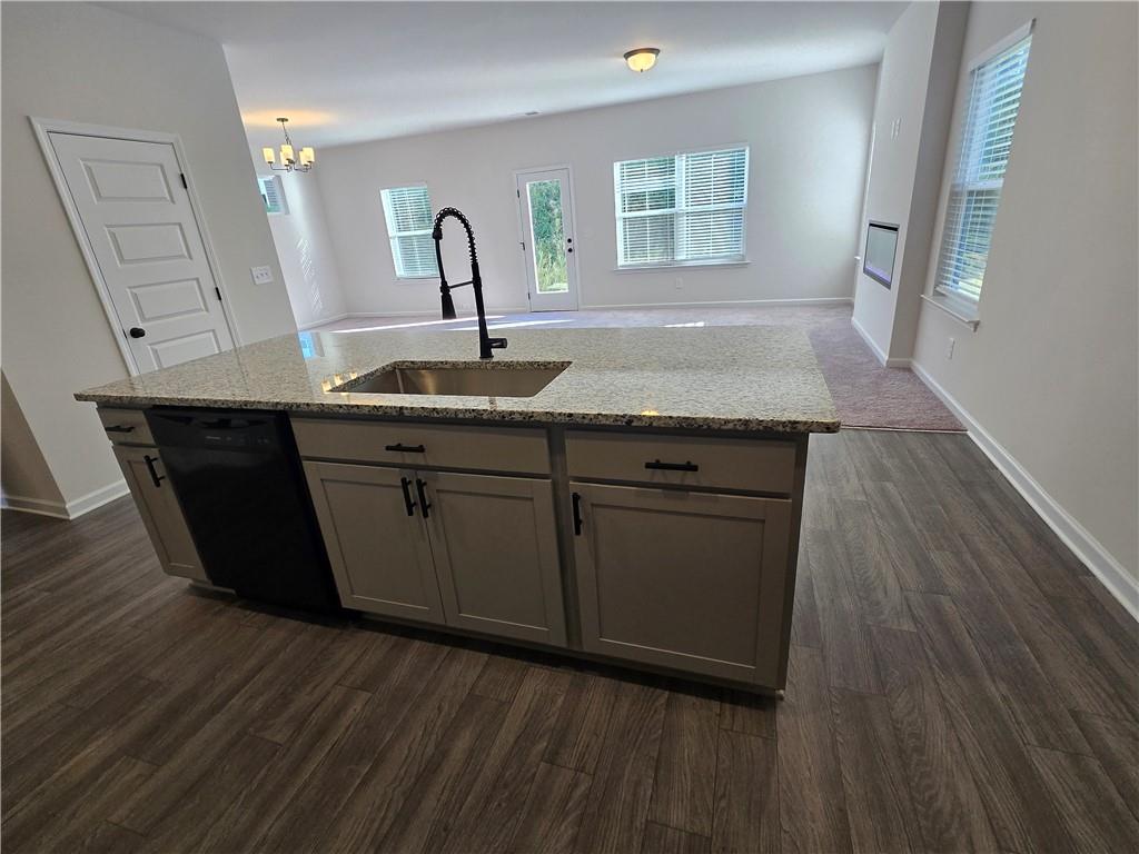 - KitchenBreakfast Bar, Cabinets Stain, Eat-in Kitchen, Kitchen Island, Pantry, Stone Counters, View to Family Room