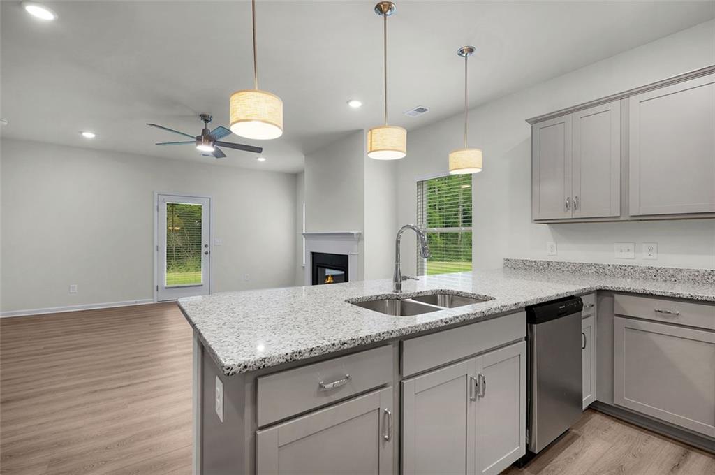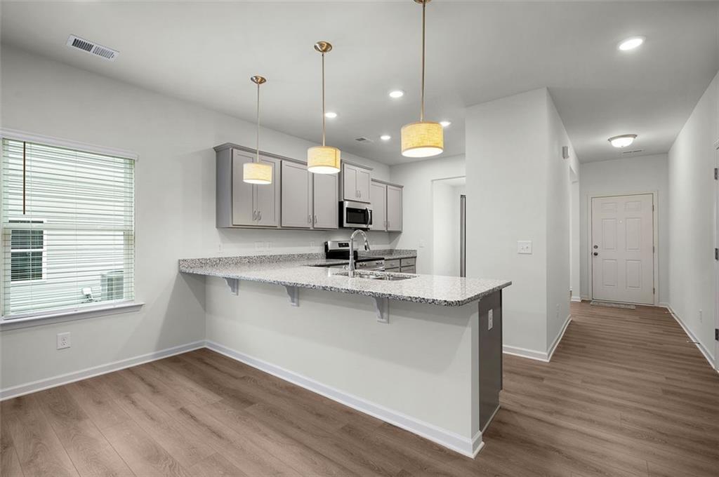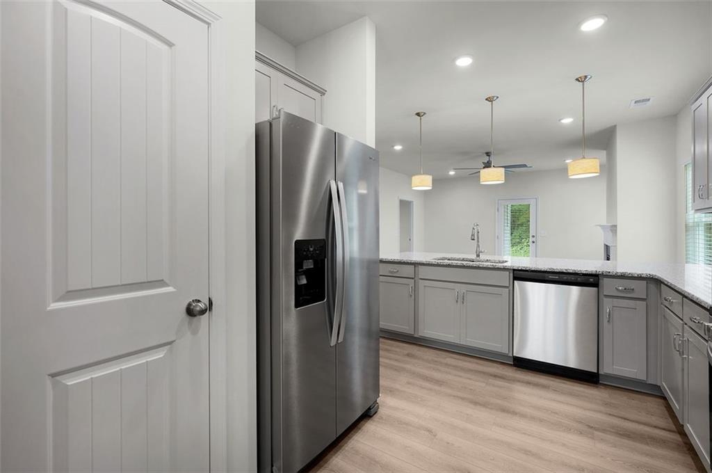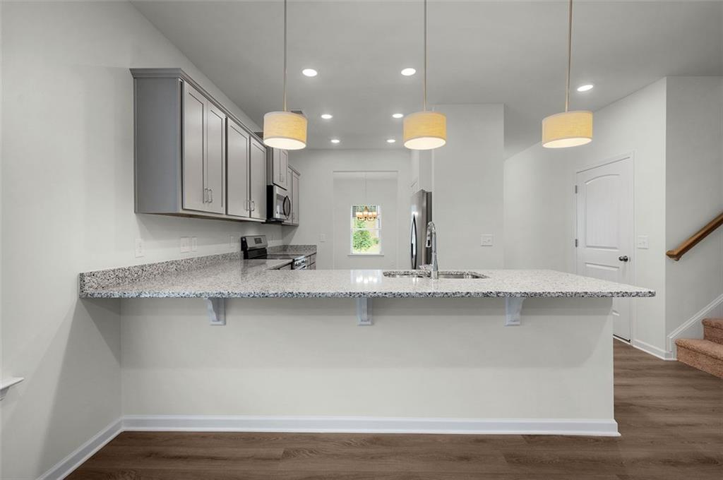 - KitchenBreakfast Bar, Cabinets Stain, Stone Counters, Pantry, View to Family Room
