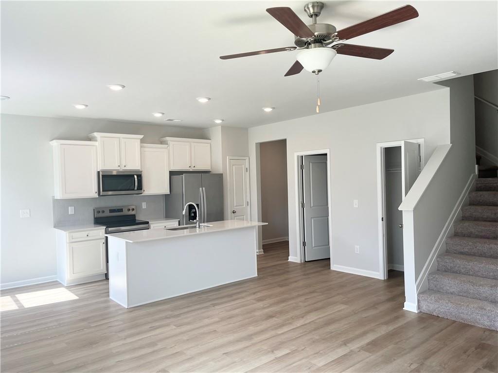 - KitchenBreakfast Bar, Cabinets White, Eat-in Kitchen, Kitchen Island, Pantry, View to Family Room