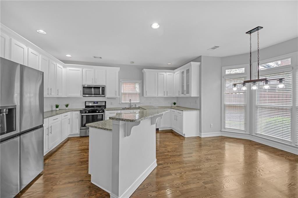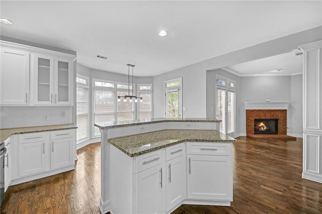 - KitchenCabinets White, Eat-in Kitchen, Kitchen Island, Pantry, Solid Surface Counters, View to Family Room