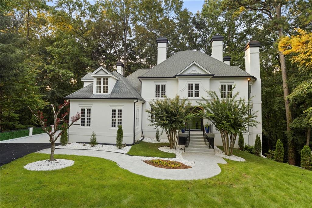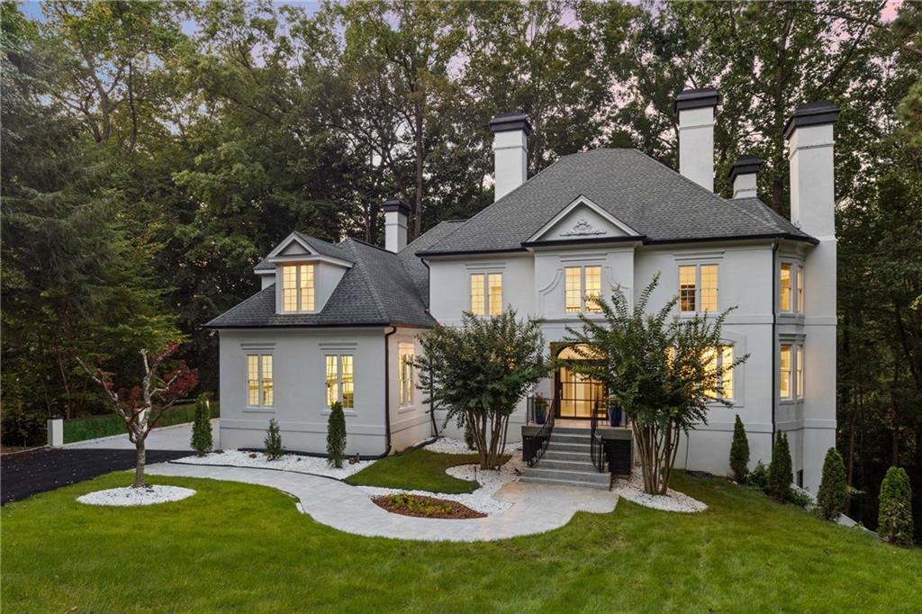 Welcome to Belle Vie, a private French eclectic estate set on a quiet cul-de-sac just 15 minutes from Buckhead and Atlanta’s best dining, shopping, and culture. Designed for both grand entertaining and everyday living, this home blends classic elegance with modern convenience. Perched above a wooded valley with a natural stream, every level of the home offers serene, year-round views. A glass-and-iron entry framed by gas lanterns sets the tone for the craftsmanship within. The chef’s kitchen is the centerpiece, with marble counters, custom cabinetry, and professional-grade appliances opening seamlessly into a vaulted great room with exposed beams and chandeliers. Upstairs, four spacious bedrooms and three full baths provide comfort and privacy. The terrace level transforms into a resort-style escape—featuring a temperature-controlled wine cellar, sauna, theatre, full bar, and game lounge—perfect for hosting or unwinding. An additional guest suite with a full bath completes the space.