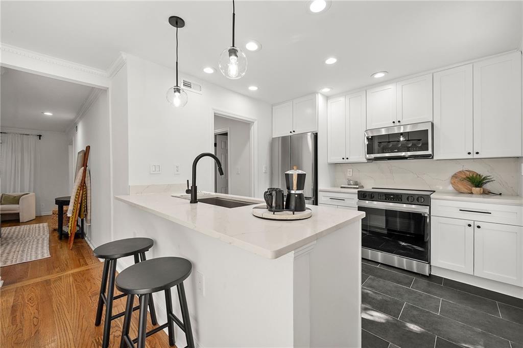 - KitchenBreakfast Bar, Cabinets White, Pantry, Stone Counters