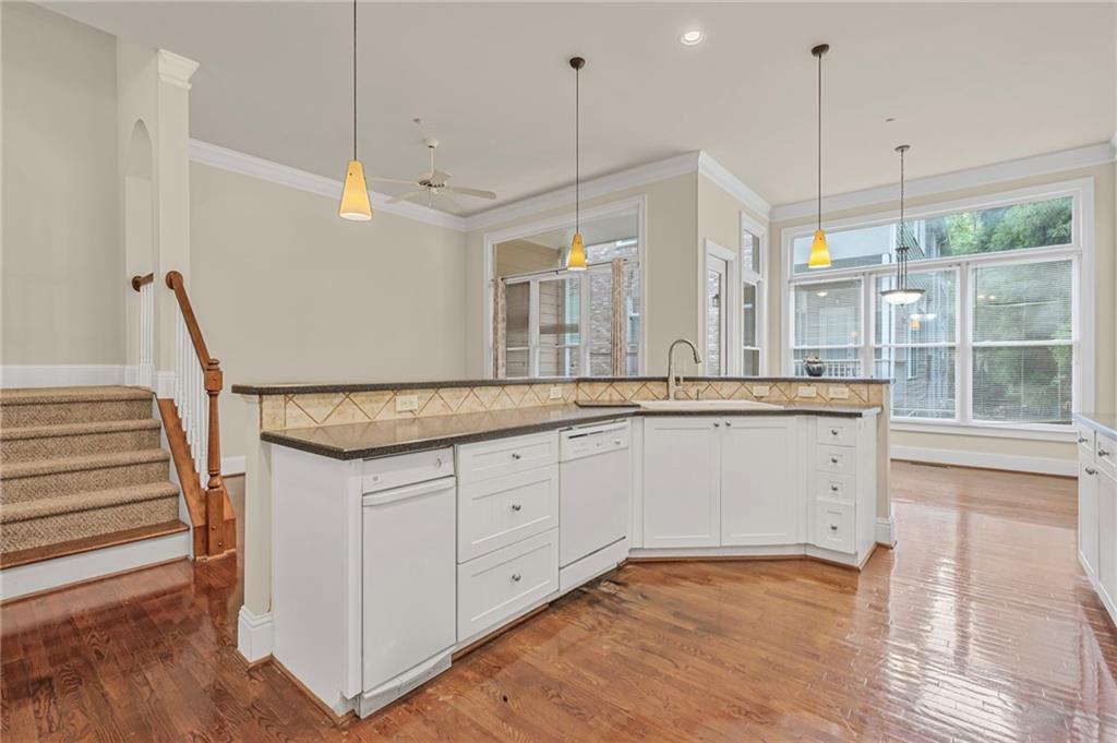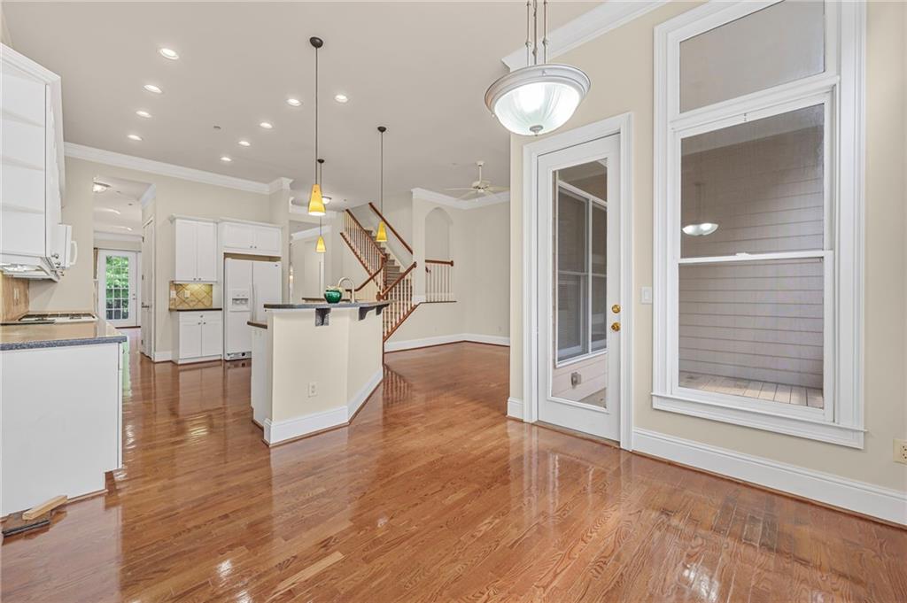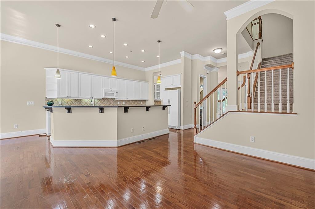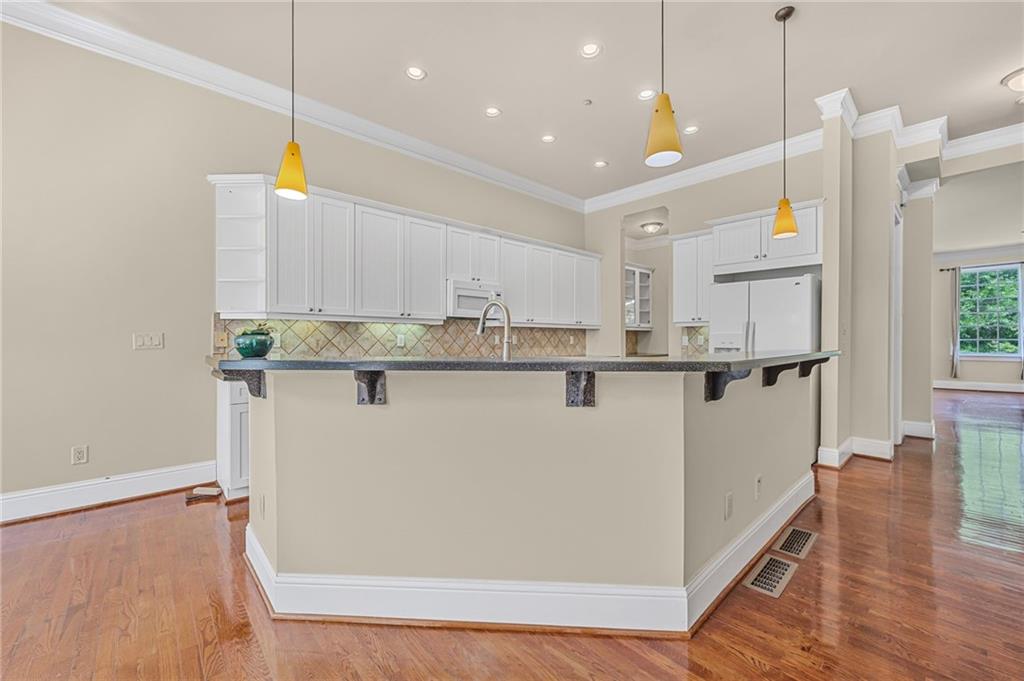 - KitchenBreakfast Bar, Breakfast Room, Cabinets White, Keeping Room, Kitchen Island, Pantry, Solid Surface Counters, View to Family Room