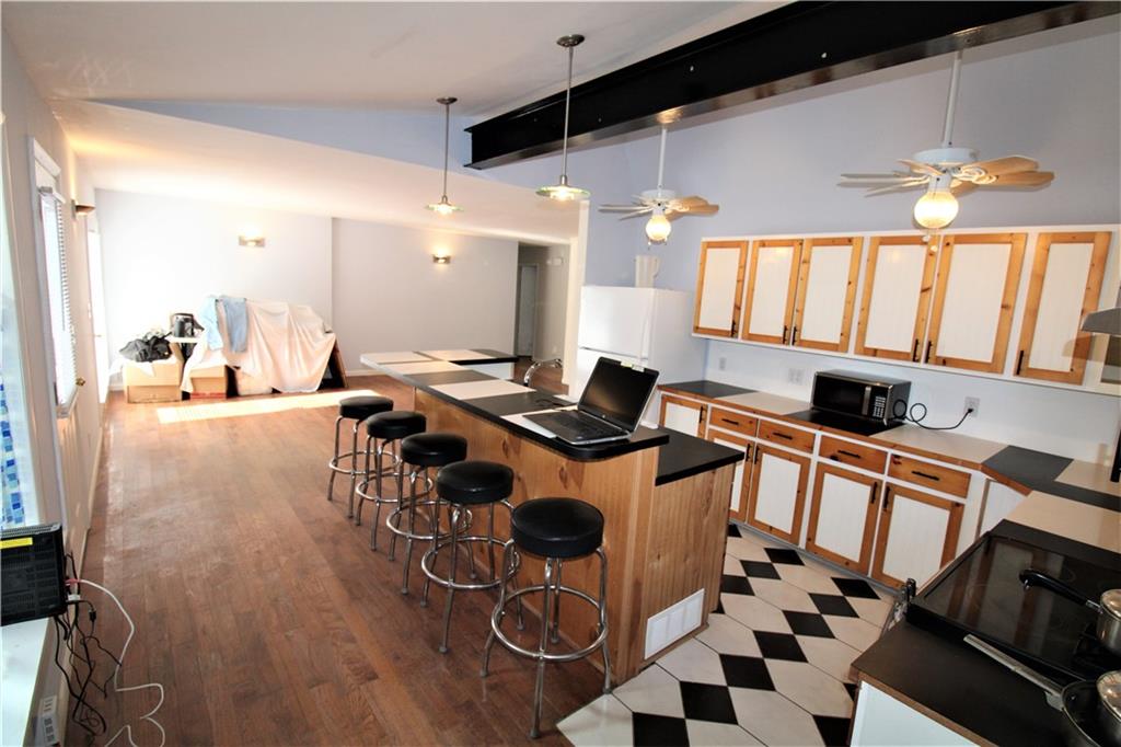 - KitchenBreakfast Bar, Cabinets Stain, Eat-in Kitchen, View to Family Room