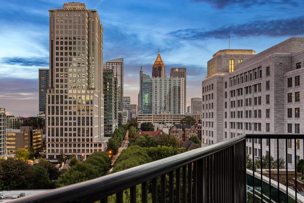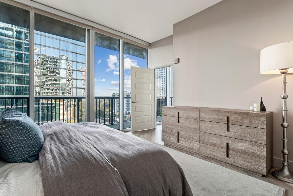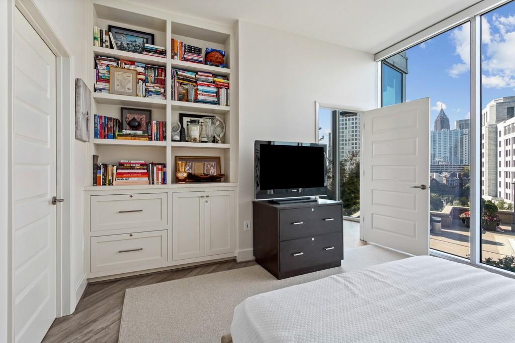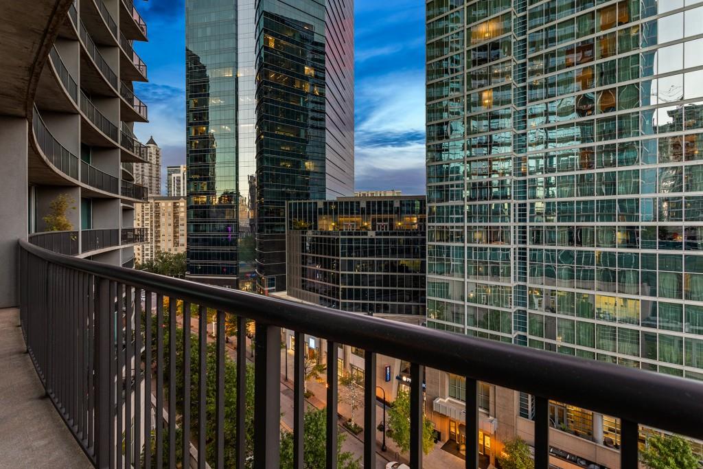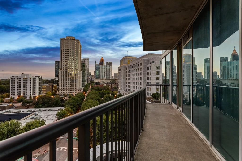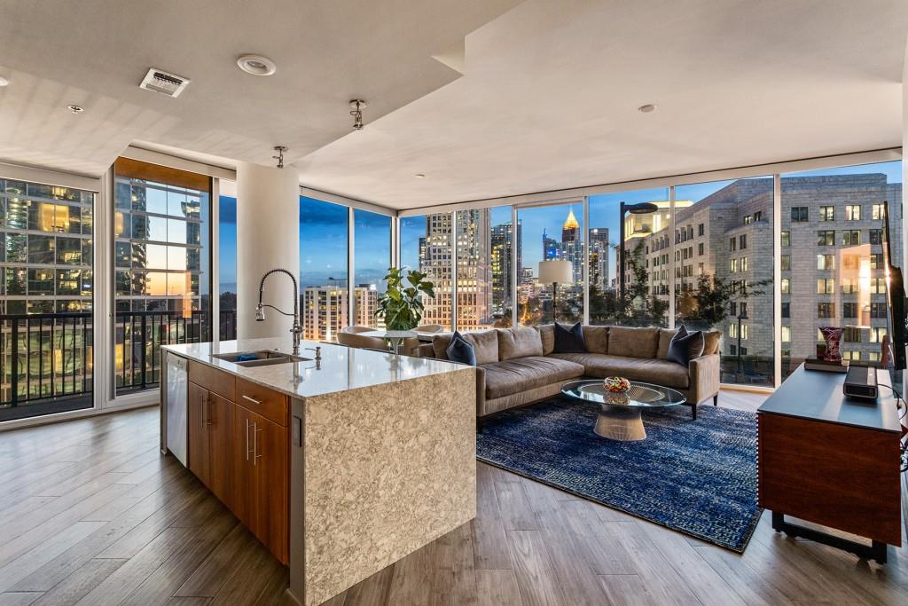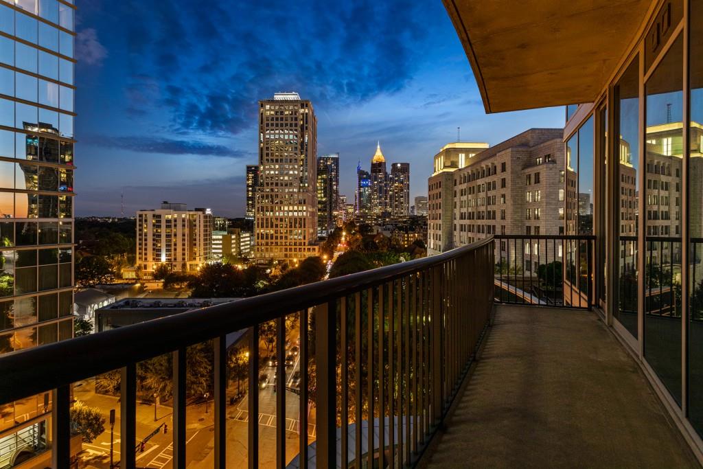 Spectacular views from the southeastern corner looking down Peachtree and over the. Federal Reserve - this residence is adorned with significant upgrades throughout including hardwood floors, beautiful quartz counters with waterfall feature, halo lighting, electric blinds, custom built-ins, custom closets, high design bathrooms with gorgeous wallcoverings. The split bedroom plan offers a sense of privacy with exceptional storage, large balcony with sweeping views of the city, open floor plan, and large breakfast bar. While entertaining, with an evening party or a lunchtime gathering, your new residence at 1010 is sure to be the envy of all your guests.