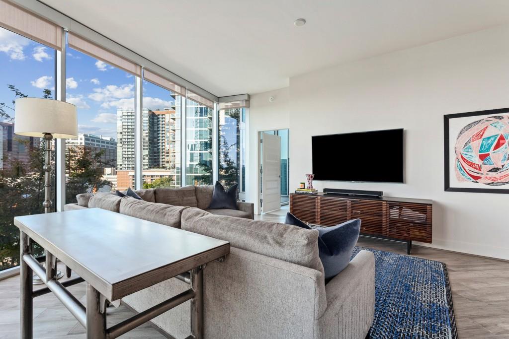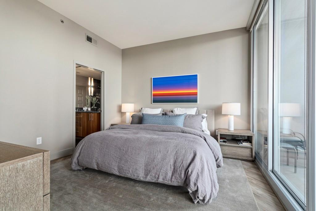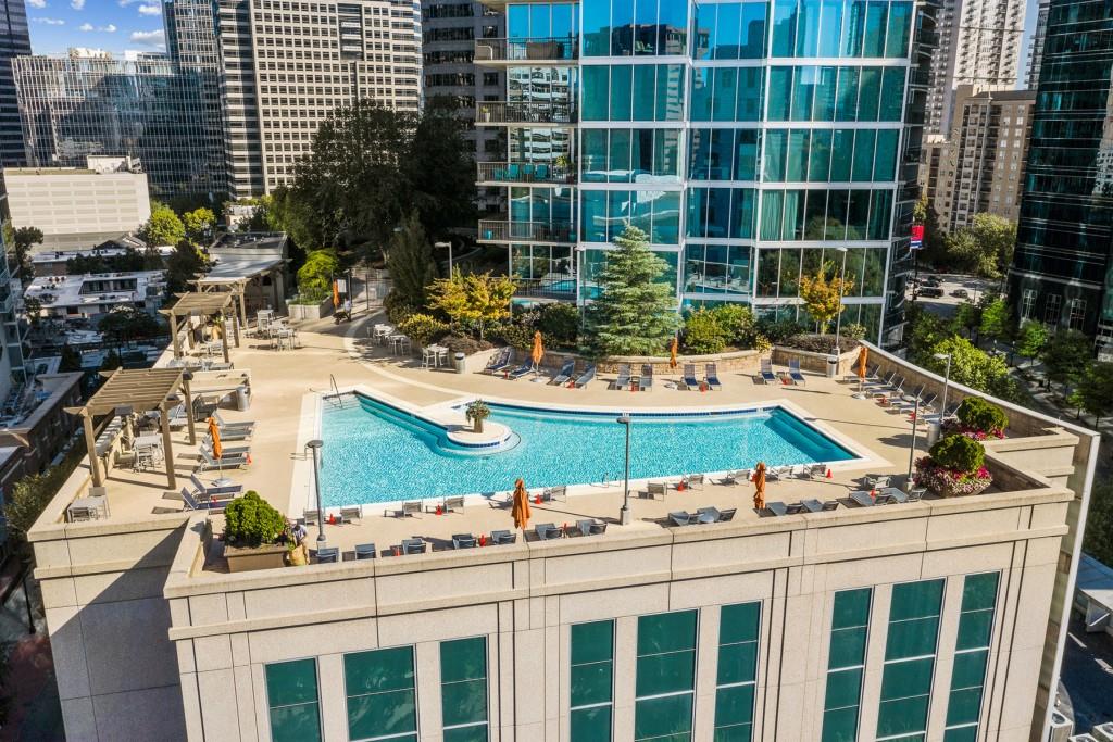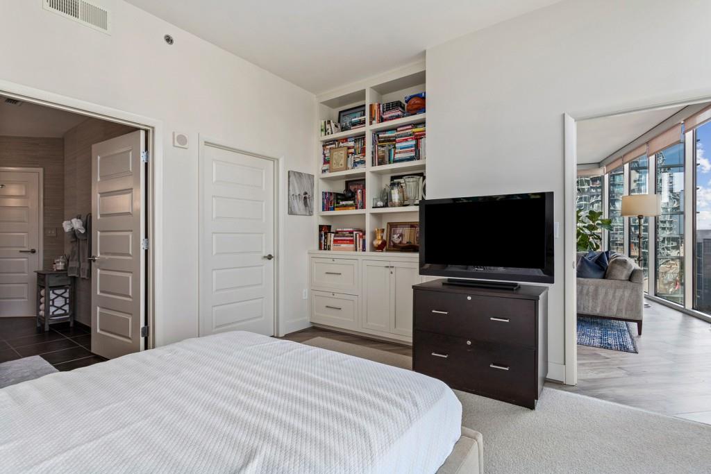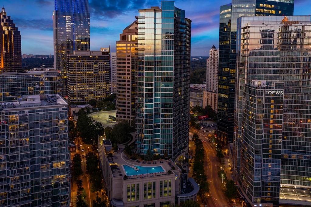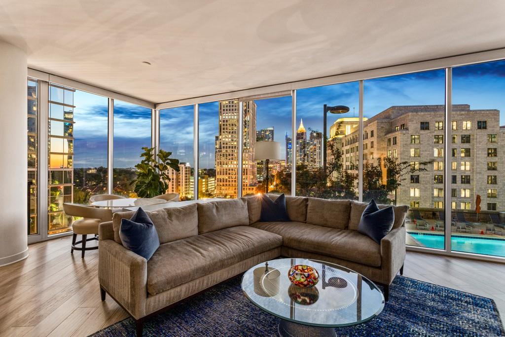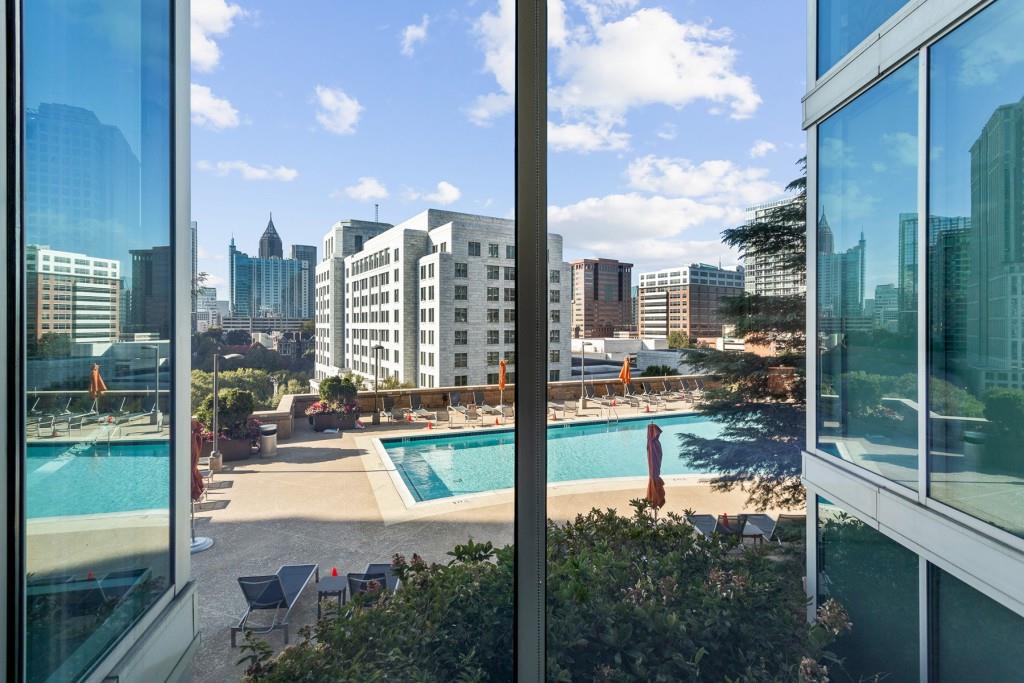 Spectacular views from the southeastern corner looking down Peachtree and over the. Federal Reserve - this residence is adorned with significant upgrades throughout including hardwood floors, beautiful quartz counters with waterfall feature, halo lighting, electric blinds, custom built-ins, custom closets, high design bathrooms with gorgeous wallcoverings. The split bedroom plan offers a sense of privacy with exceptional storage, large balcony with sweeping views of the city, open floor plan, and large breakfast bar. While entertaining, with an evening party or a lunchtime gathering, your new residence at 1010 is sure to be the envy of all your guests.