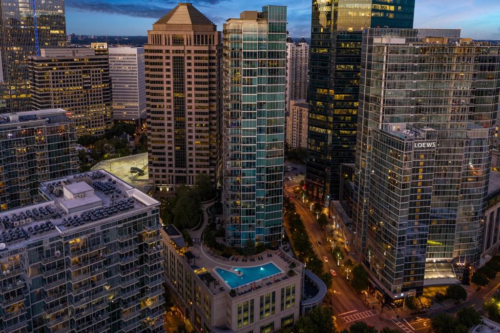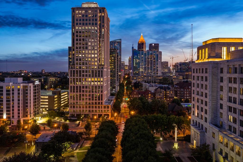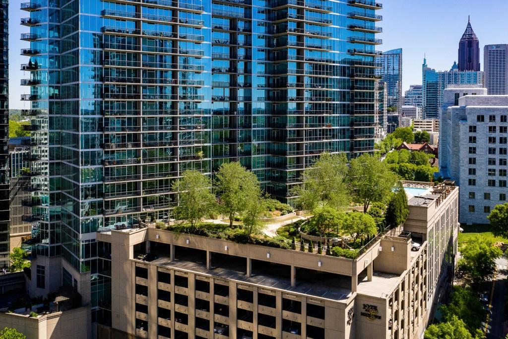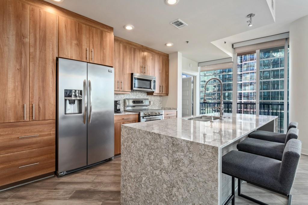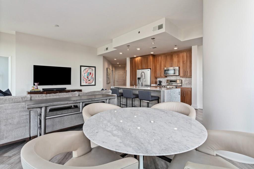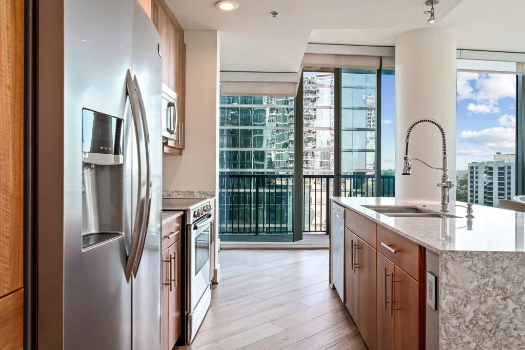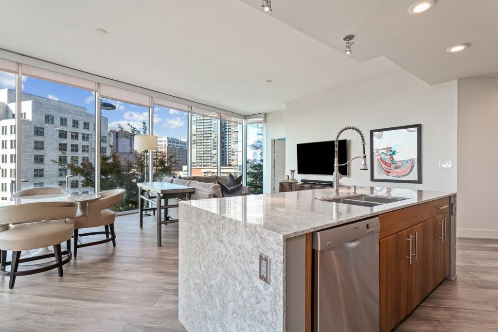 Spectacular views from the southeastern corner looking down Peachtree and over the. Federal Reserve - this residence is adorned with significant upgrades throughout including hardwood floors, beautiful quartz counters with waterfall feature, halo lighting, electric blinds, custom built-ins, custom closets, high design bathrooms with gorgeous wallcoverings. The split bedroom plan offers a sense of privacy with exceptional storage, large balcony with sweeping views of the city, open floor plan, and large breakfast bar. While entertaining, with an evening party or a lunchtime gathering, your new residence at 1010 is sure to be the envy of all your guests.