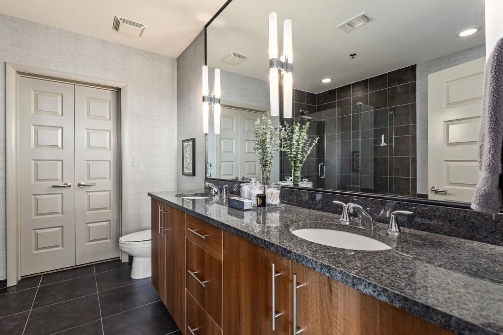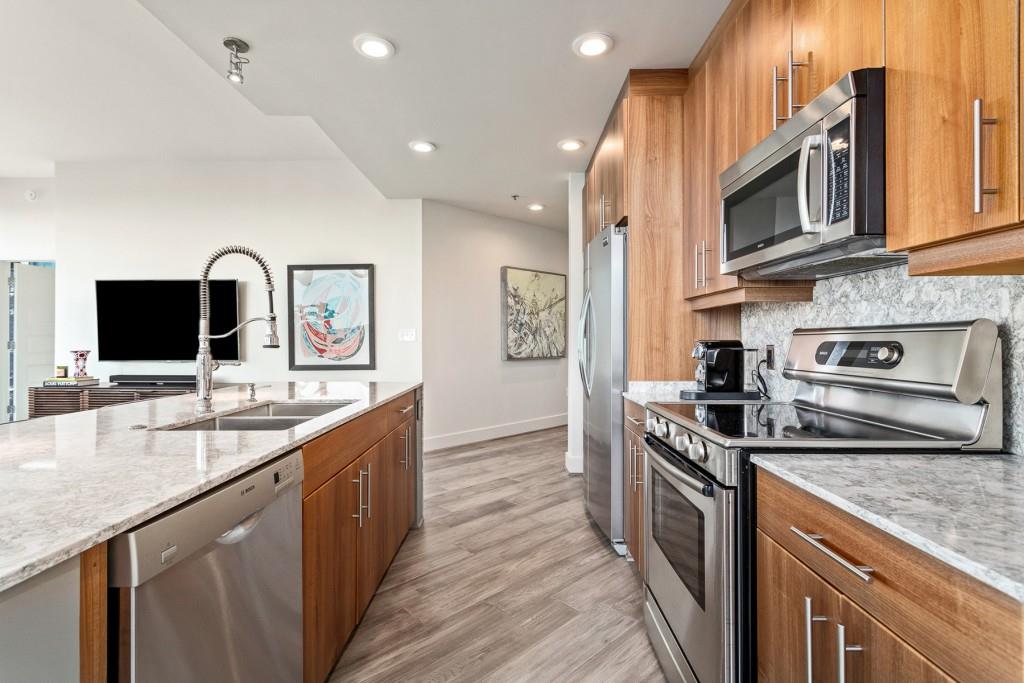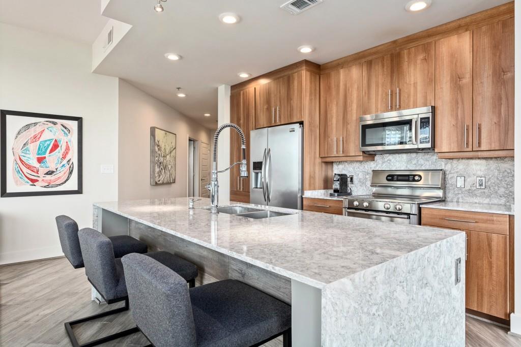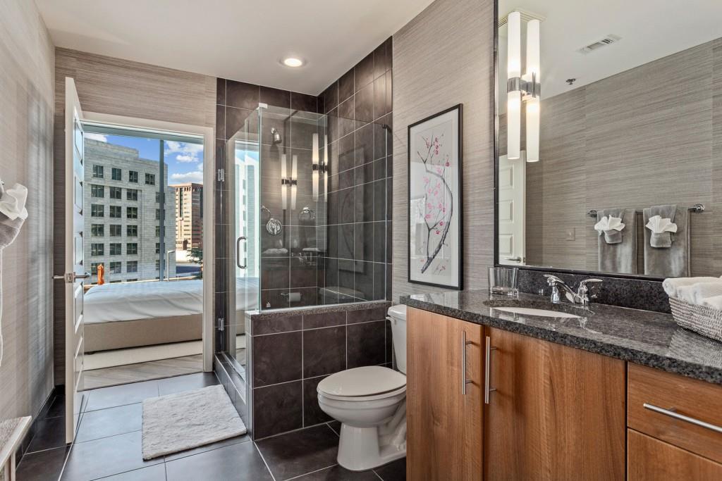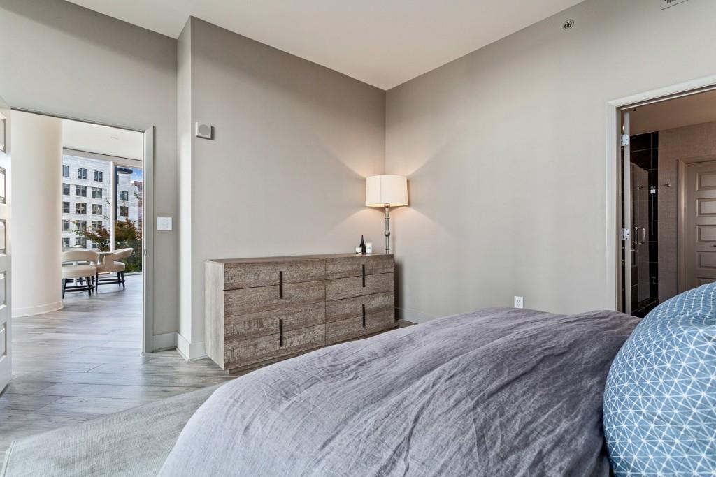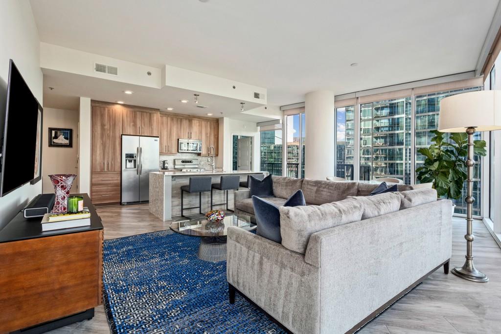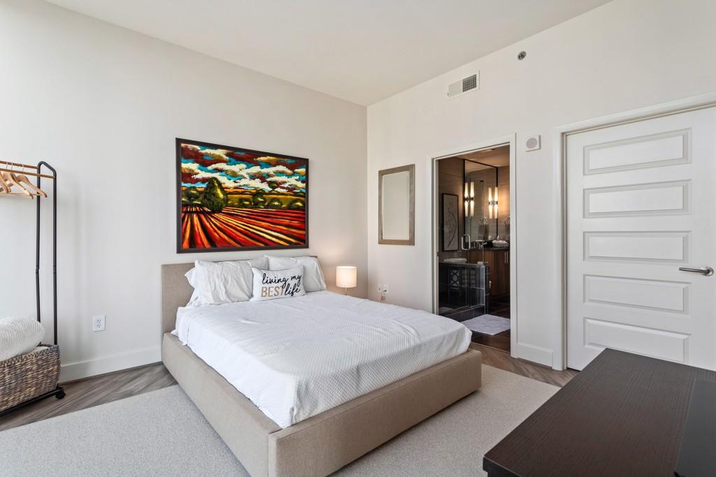 Spectacular views from the southeastern corner looking down Peachtree and over the. Federal Reserve - this residence is adorned with significant upgrades throughout including hardwood floors, beautiful quartz counters with waterfall feature, halo lighting, electric blinds, custom built-ins, custom closets, high design bathrooms with gorgeous wallcoverings. The split bedroom plan offers a sense of privacy with exceptional storage, large balcony with sweeping views of the city, open floor plan, and large breakfast bar. While entertaining, with an evening party or a lunchtime gathering, your new residence at 1010 is sure to be the envy of all your guests.