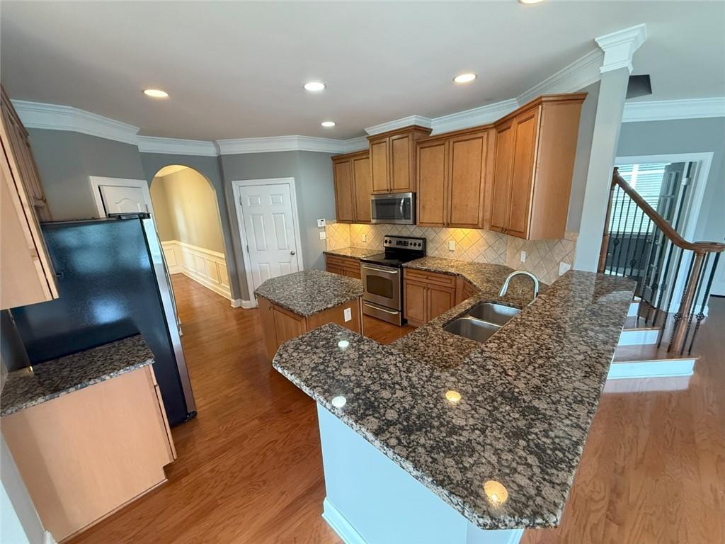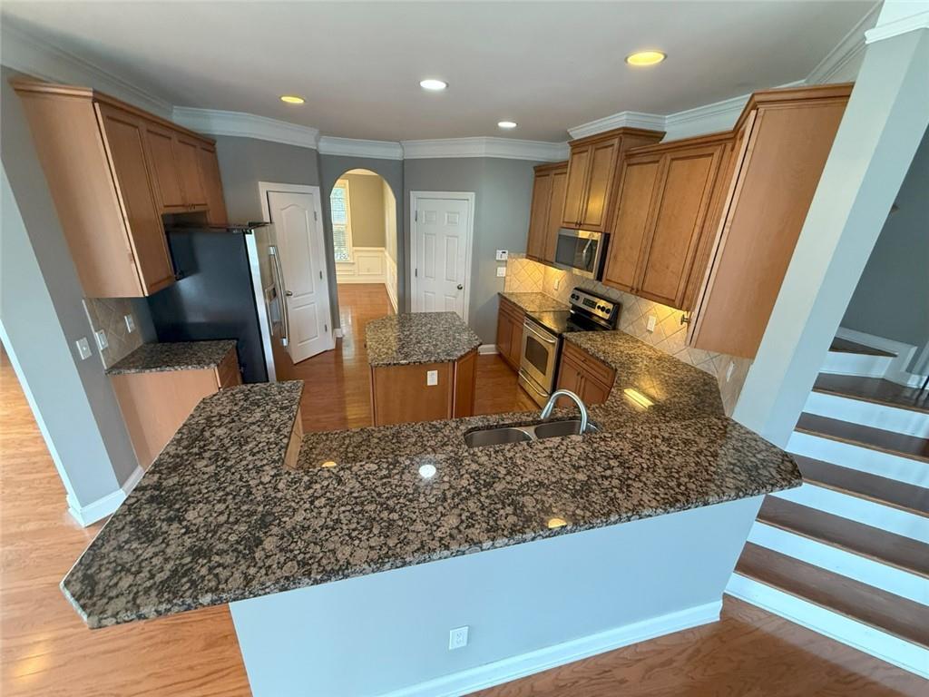 - KitchenBreakfast Bar, Cabinets Stain, Eat-in Kitchen, Kitchen Island, Pantry, Stone Counters, View to Family Room