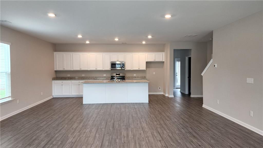 - KitchenCabinets White, Kitchen Island, Pantry Walk-In, Stone Counters, View to Family Room