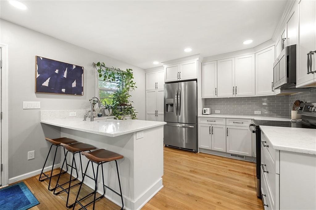 - KitchenBreakfast Bar, Cabinets White, Stone Counters