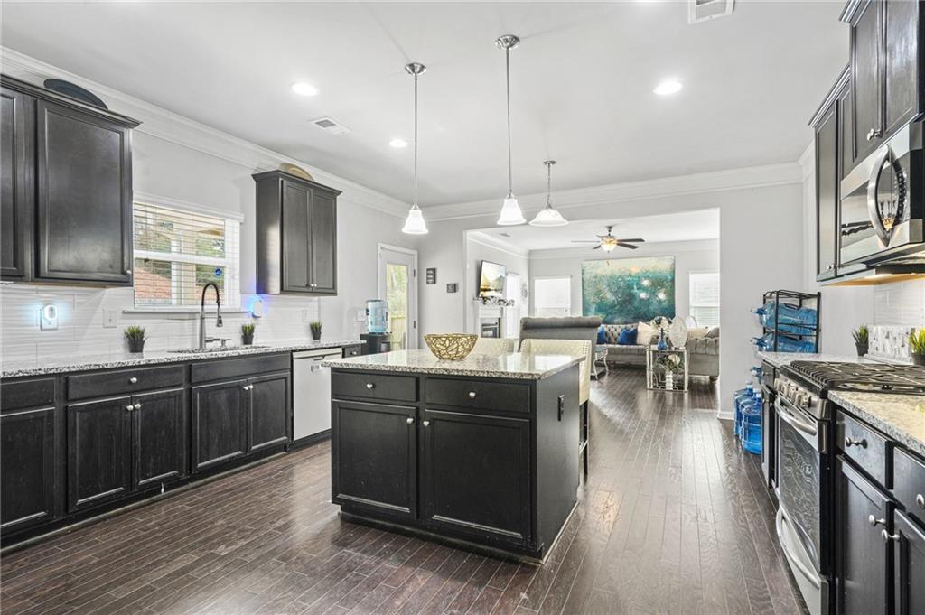- KitchenCabinets Stain, Eat-in Kitchen, Kitchen Island, Pantry Walk-In, Stone Counters, View to Family Room