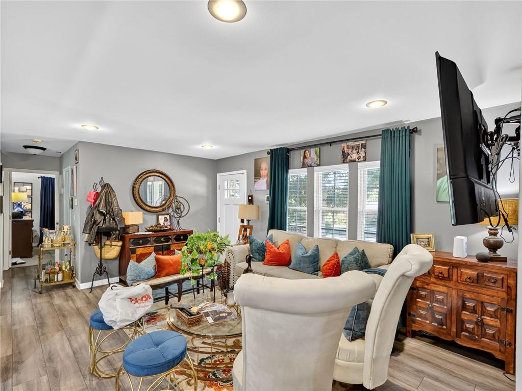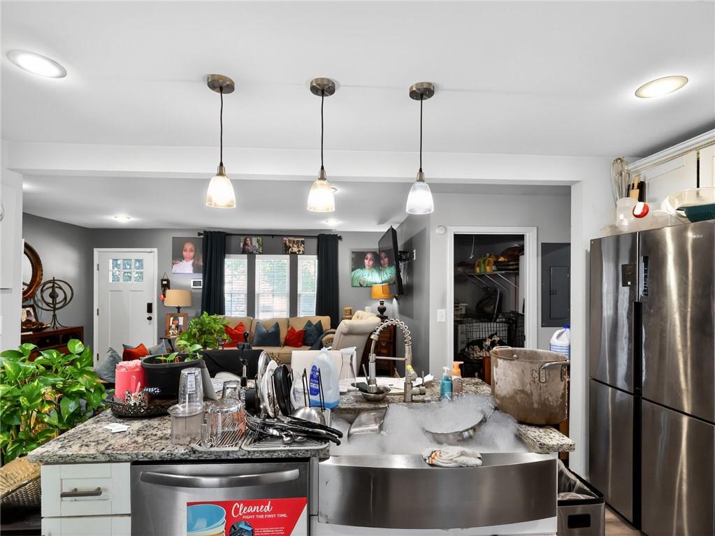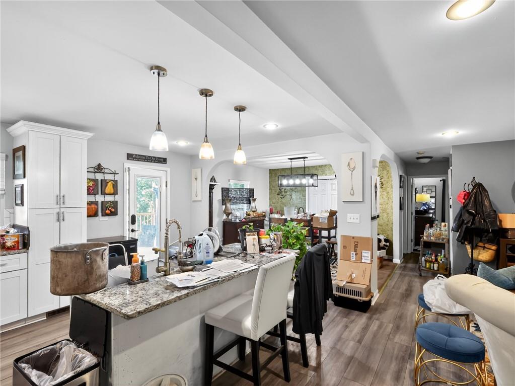 - KitchenBreakfast Bar, Cabinets White, Kitchen Island, View to Family Room