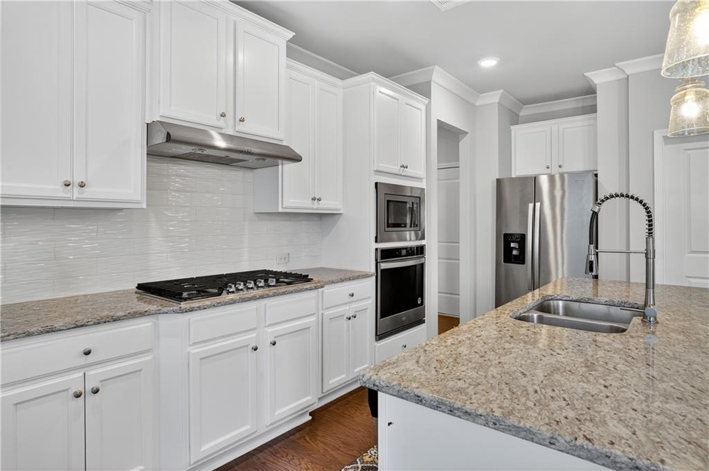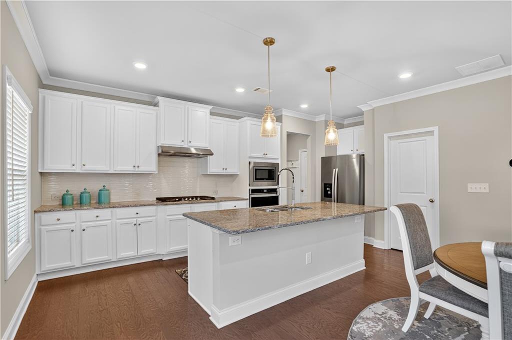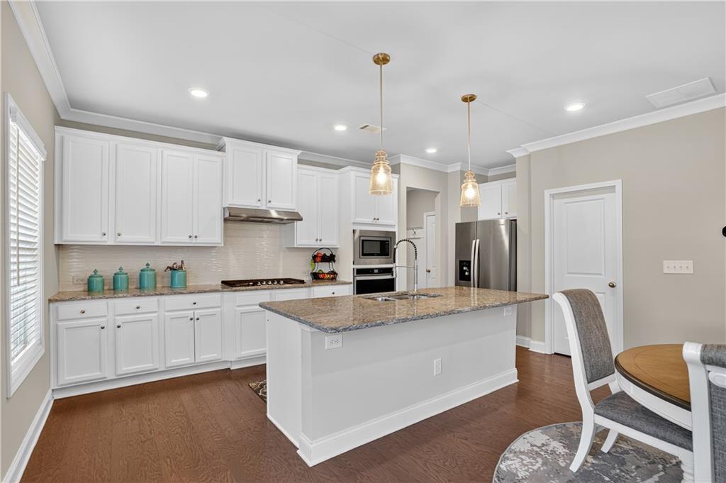 - KitchenCabinets White, Kitchen Island, Pantry, Eat-in Kitchen, Stone Counters, View to Family Room
