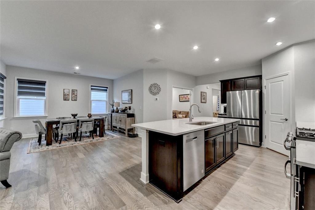 - KitchenCabinets Stain, Solid Surface Counters, Kitchen Island, Pantry Walk-In, View to Family Room