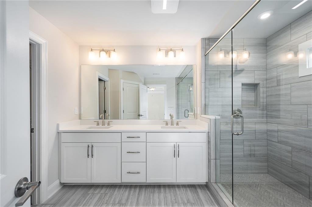 Move in today! Welcome Home to the Gated community of EVINS WALK with a community POOL & courtyard! Two gated entrances. Newer 2022 END UNIT townhome in Brookhaven features an open floor plan with 9-ft ceilings, stone fireplace, hardwood flooring + walk out basement. Abundant natural sunlight with so many windows! White Chef's Kitchen opens to fireside Den & large grilling Deck for easy comfortable entertaining. Kitchen features quartz counters, new SS Appliances, sizable prep Island, soft close white cabinetry & sizable pantry. Many upgrades throughout! Large Bedrooms with ample closet space. Huge primary Bedroom Suite with amazing ensuite Bath. Terrace level offers a private fourth Bedroom with two closets + Full Bath that opens to lush green space. Two Car Garage + Driveway Parking. Garage offers additional storage. Ample onsite guest parking nearby. Convenient to shopping, groceries, eateries, coffee houses! Minutes to interstate access.