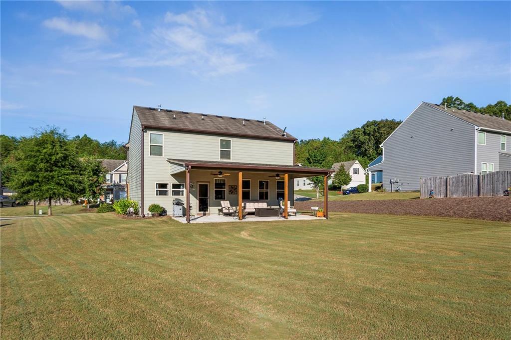 Prepare to be wowed by this incredible home with brand NEW INTERIOR PAINT!! You'll be just minutes from sought-after schools, charming downtown Ball Ground, and have easy access to shopping, restaurants, and major highways. But the real star of the show? The backyard oasis! Already huge and flat, it's now been taken to the next level with OVER $42,000 in RECENT UPGRADES. We're talking an extended driveway and patio with coverage, a massive NEWER COVERED PATIO complete with fans for year-round enjoyment, NEWER exterior paint, UPDATED lighting, NEWER front and back porch columns, BEADBOARD and NEWER storage SHED—plus so much more! This isn't just a yard; it's an absolute dream for any activity, from entertaining to playing, highlighted by gorgeous, year-round blooming flowers and lush landscaping. And don't forget the beautiful, updated rocking chair front porch that greets you! Step inside to discover an ideal layout for modern living. The bright and spacious living area is anchored by a kitchen built for functionality, boasting a large central island, tons of storage space, and easy flow. A perfectly sized laundry room is handily located on the main floor. When it's time to unwind, the upstairs primary bedroom offers a private sanctuary, featuring the desired dual vanity, a separate shower and tub setup, and an expansive walk-in closet. This is a true gem—come see the best backyard in the neighborhood!