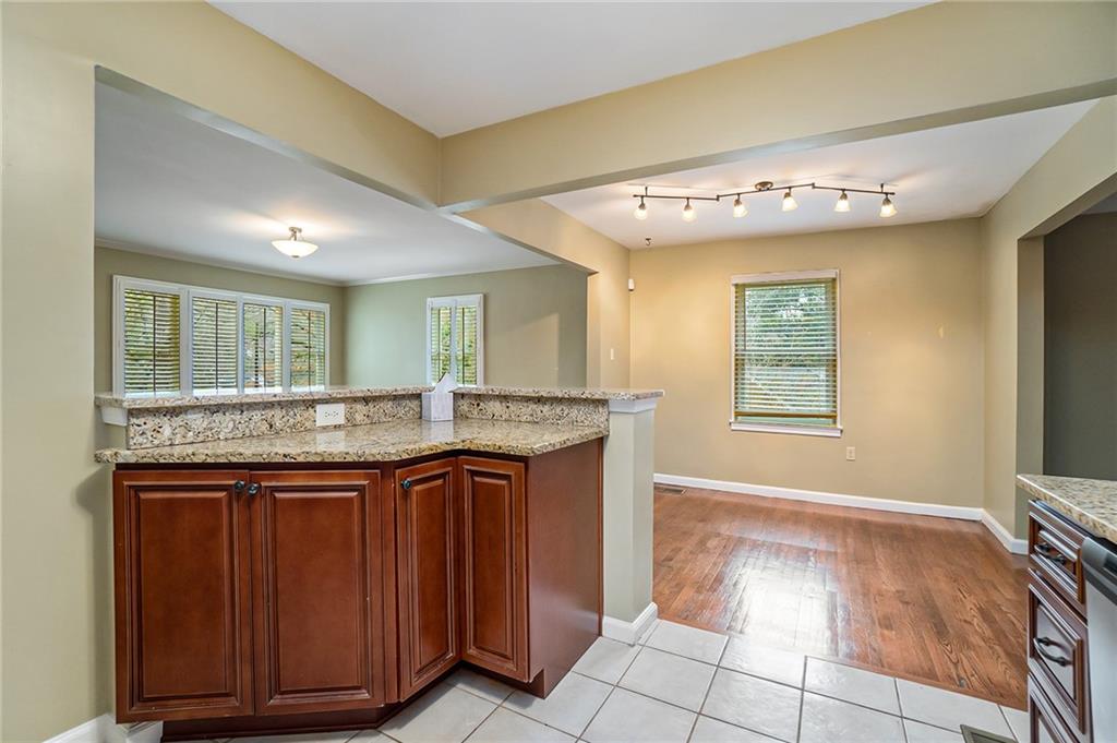 - KitchenBreakfast Bar, Cabinets Stain, View to Family Room