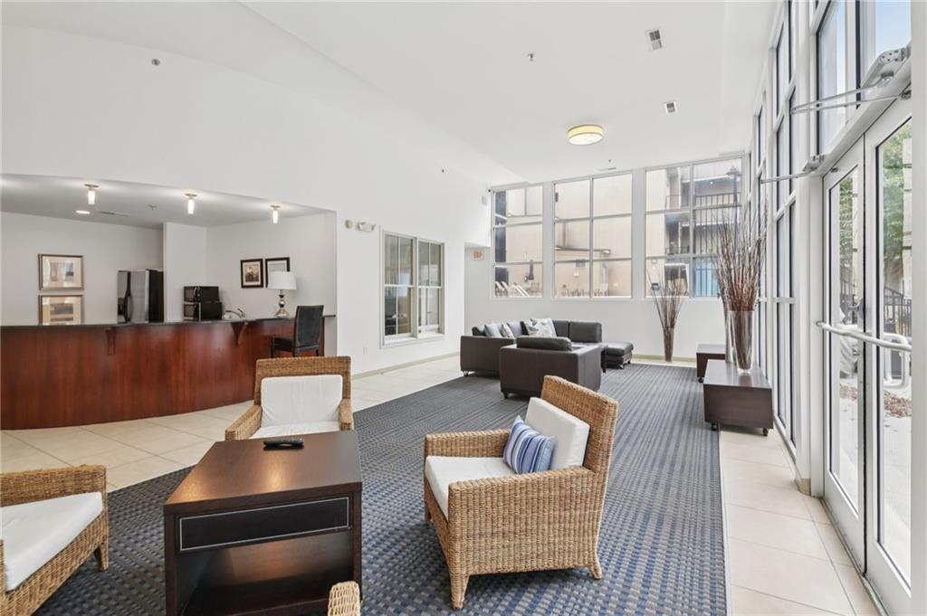 Beautiful, move-in ready end-unit condo filled with natural light! The open layout features a spacious living room with a wall of windows and gorgeous hardwood floors throughout. The updated kitchen is a showstopper with a breakfast bar, stylish white cabinetry, quartz countertops, tile backsplash, and stainless steel appliances. The primary suite is a true retreat, offering tons of light and access to a newly renovated wraparound balcony. A sliding barn door leads to the spa-like en-suite bath with dual sinks, granite countertops, walk-in shower, and 2nd separate tub/shower combo, plus a large walk-in closet. A roommate-style floor plan provides privacy with a second spacious bedroom and nearby full bath. The laundry room includes updated washer and dryer. Building amenities are right at your doorstep, including a fitness center, clubhouse, and pool—located on the same floor for ultimate convenience. Additional features include a secure parking garage, and easy side entrance access to the unit. Perfectly situated just 10–15 minutes from anywhere in Atlanta, with quick access to the airport, Beltline, parks, shopping, and endless dining options. Book your tour today!