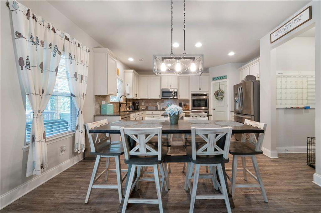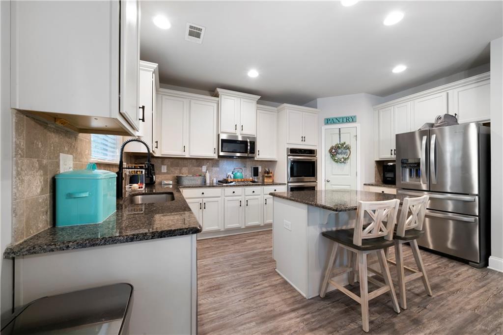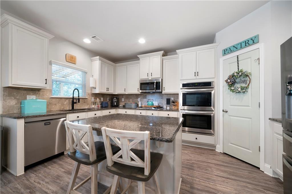 - KitchenBreakfast Bar, Cabinets White, Eat-in Kitchen, Kitchen Island, Pantry, Pantry Walk-In, Stone Counters, View to Family Room