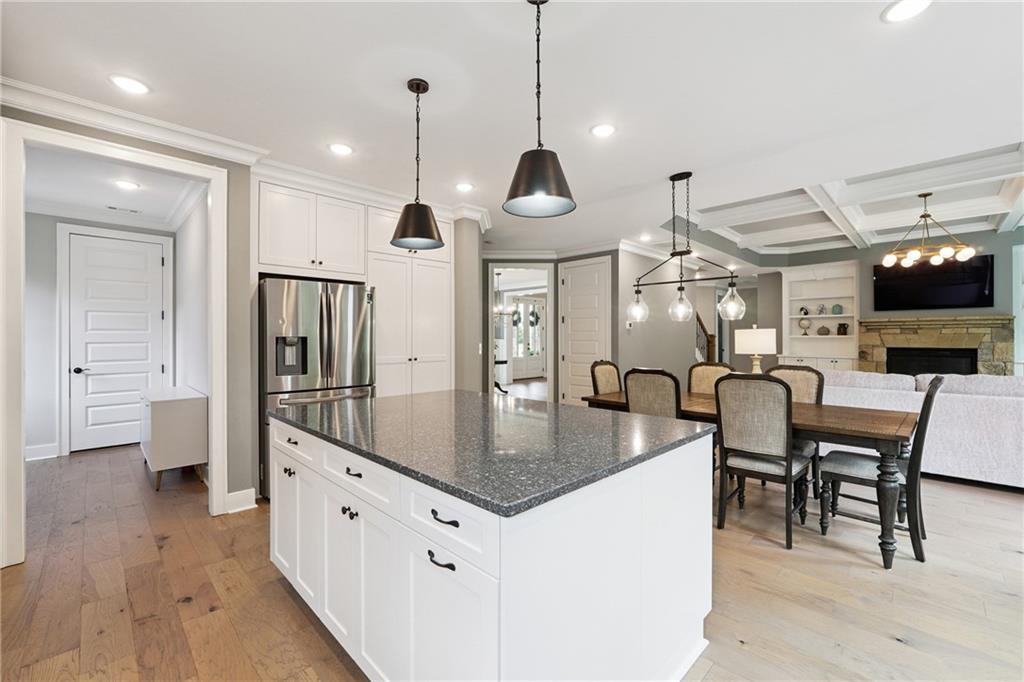 - KitchenBreakfast Bar, Cabinets White, Eat-in Kitchen, Kitchen Island, Pantry Walk-In, Stone Counters, View to Family Room