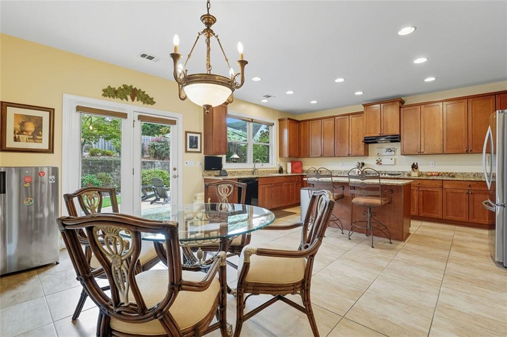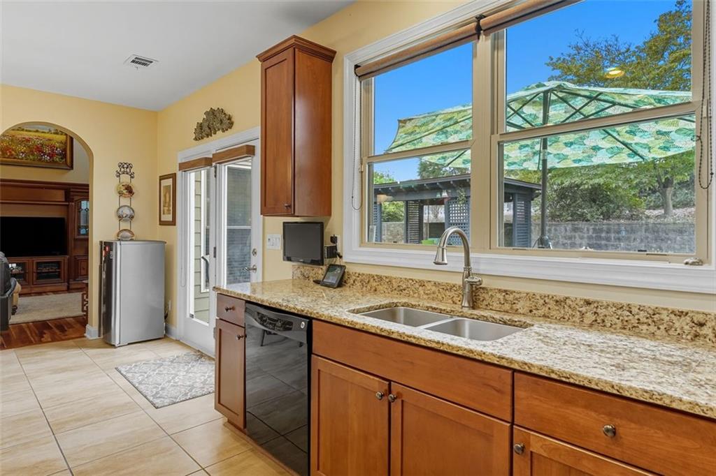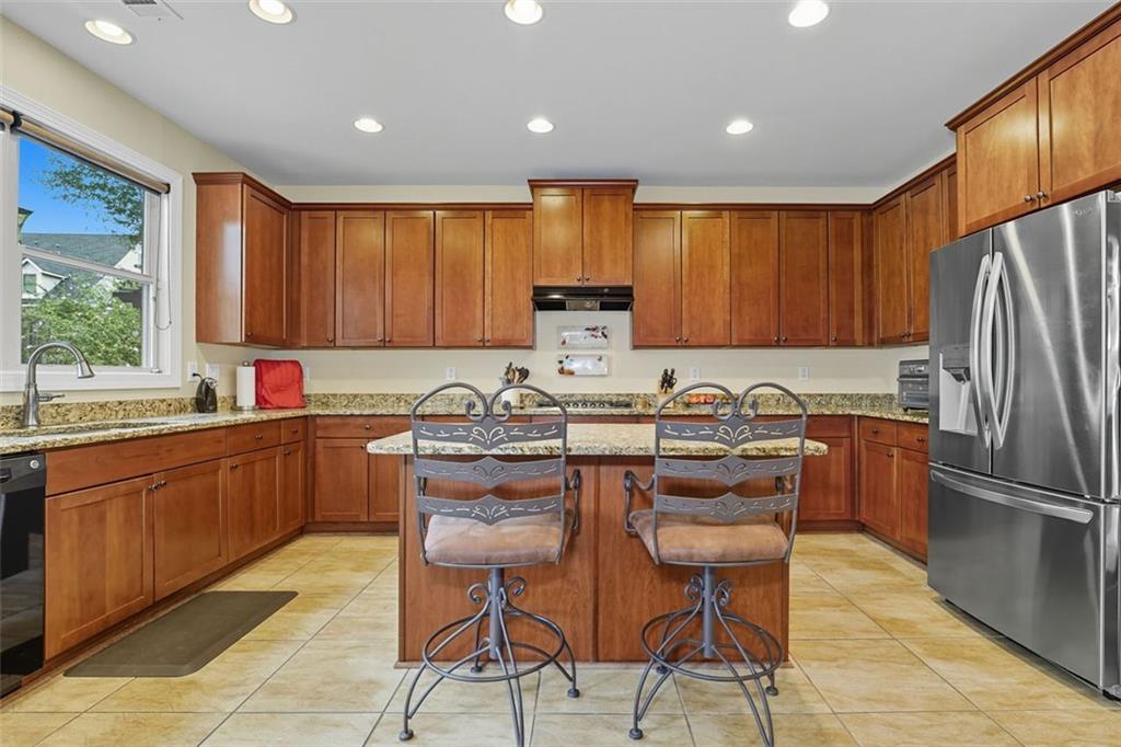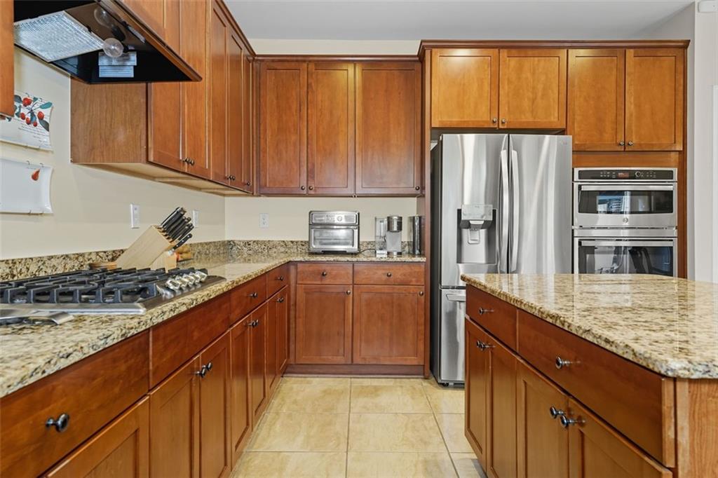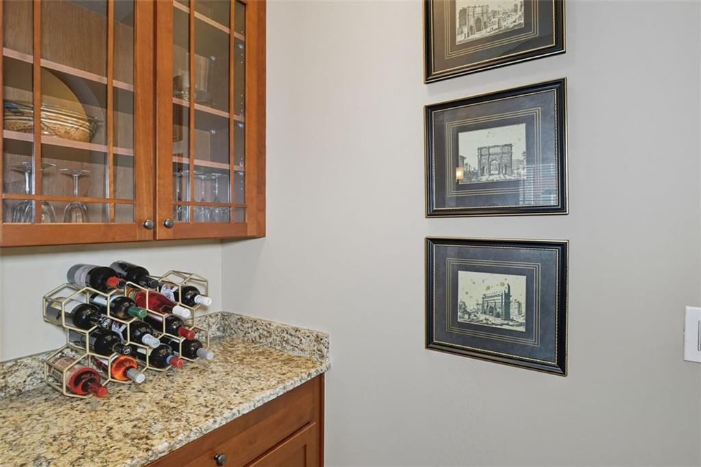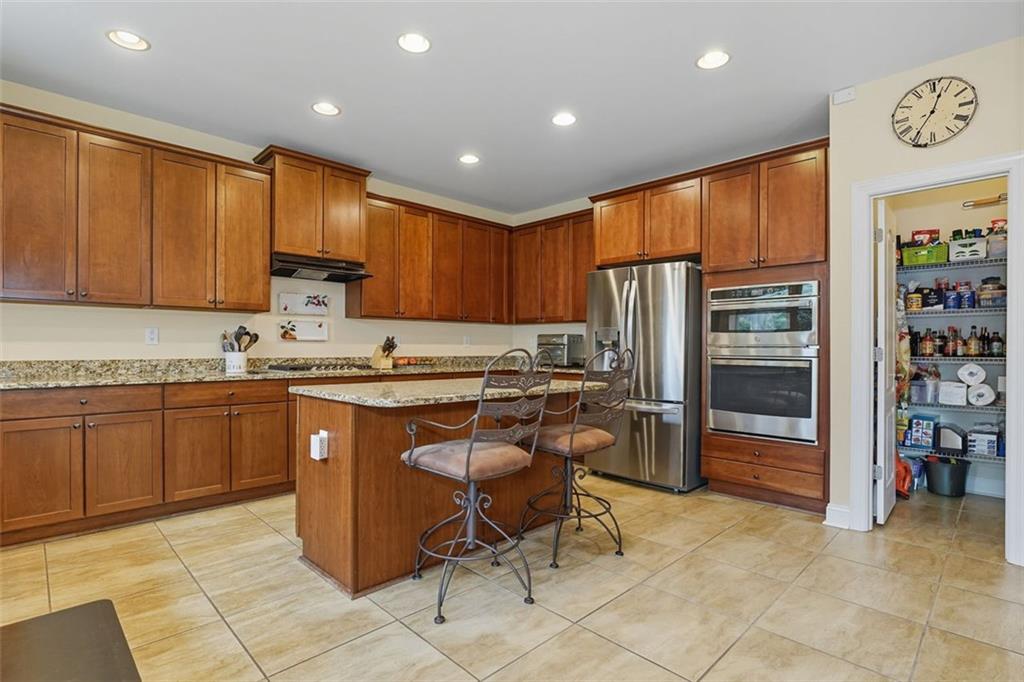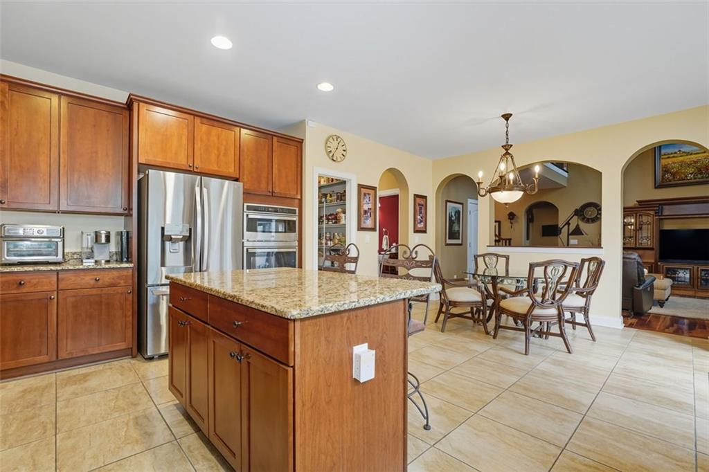 - KitchenCabinets Stain, Stone Counters, Kitchen Island, Pantry, View to Family Room