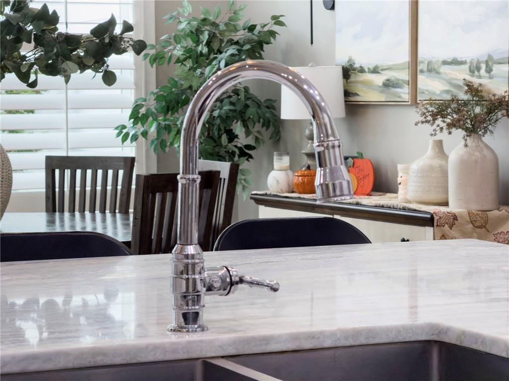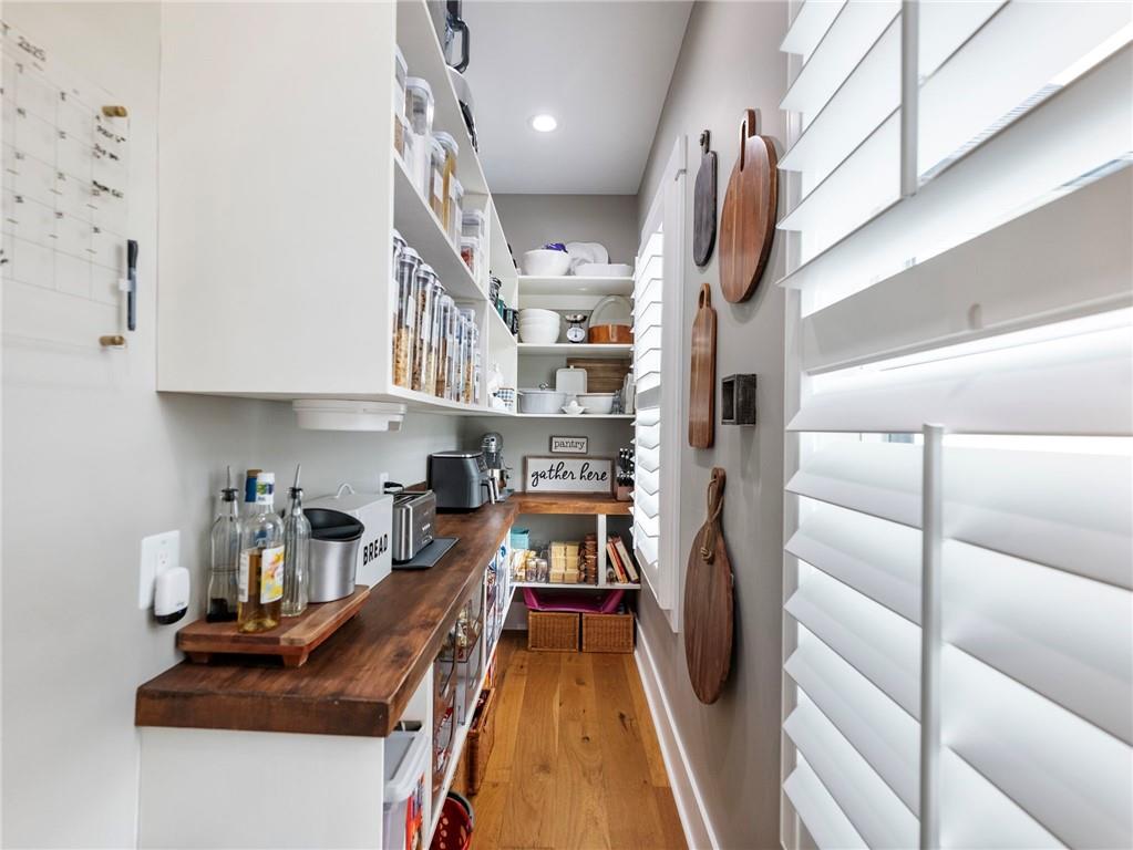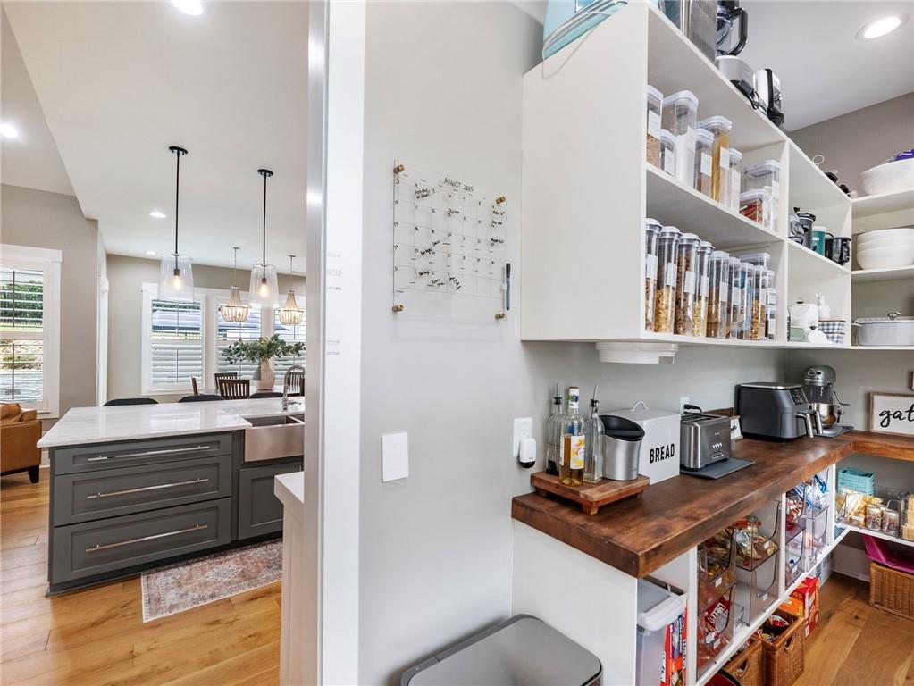 - KitchenCabinets White, Pantry Walk-In, Stone Counters, View to Family Room