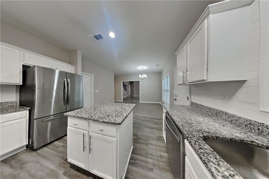 - KitchenCabinets White, Eat-in Kitchen, Kitchen Island, Laminate Counters, View to Family Room