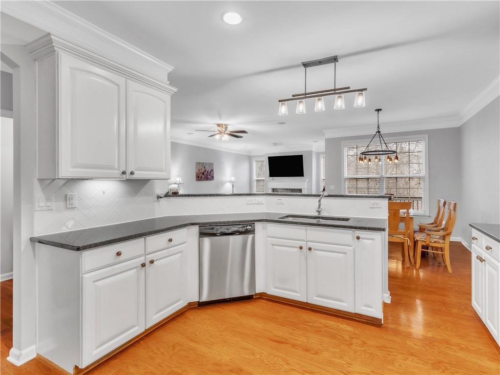 - KitchenBreakfast Bar, Cabinets White, Pantry, Solid Surface Counters, View to Family Room