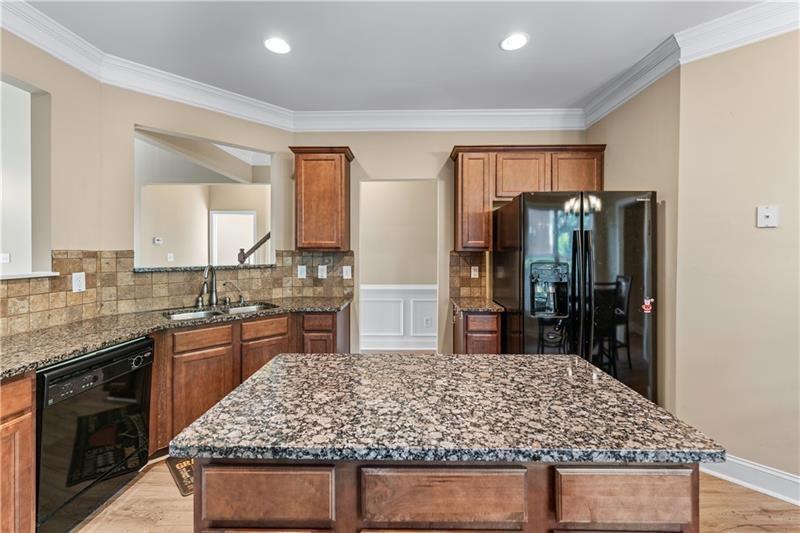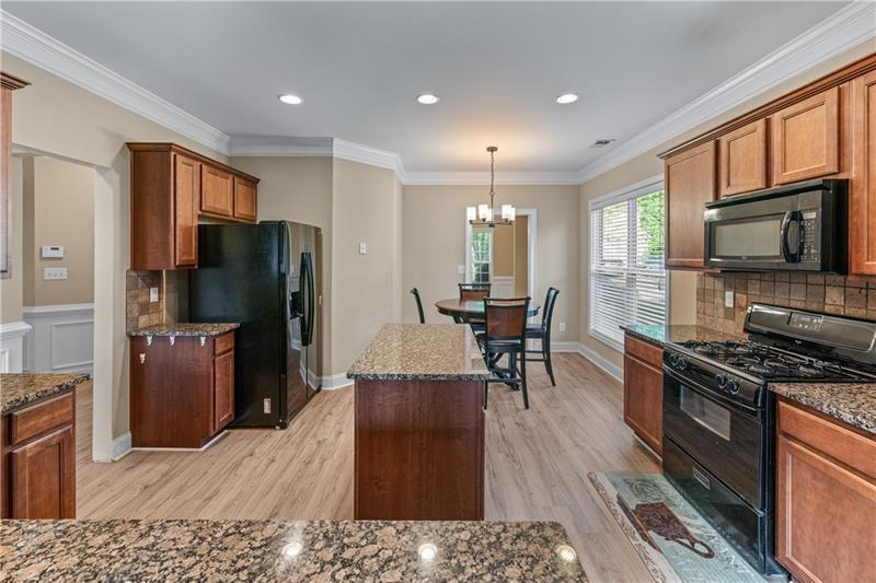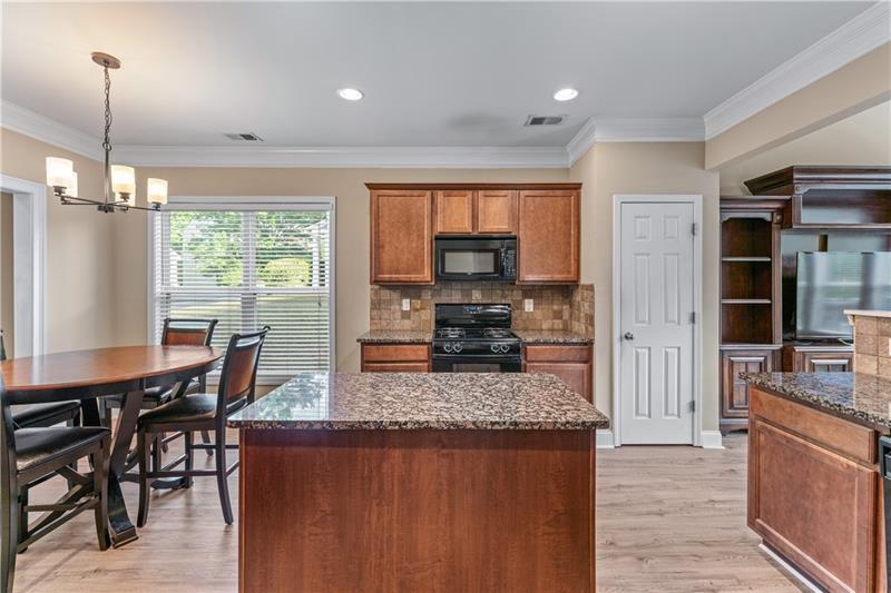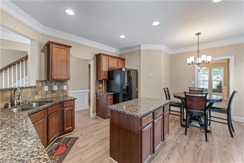 - KitchenCabinets Stain, Eat-in Kitchen, Kitchen Island, Stone Counters, View to Family Room